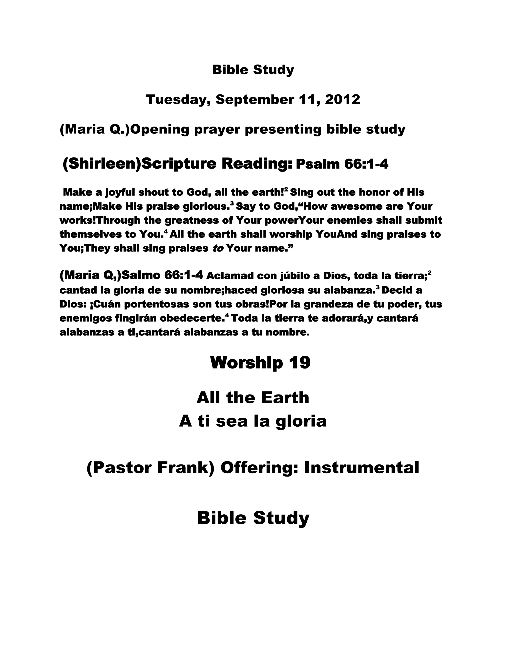 This document summarizes bible studies and worship services from September 9-14, 2012. It includes scripture readings from Psalm 66 and John 3 about being joyful toward God and the need to be born again. The services featured worship music, offerings, intercessory prayer, and messages from Pastors Frank, Yari, and Jeff. Visitors included Pastors Yari and Edna.