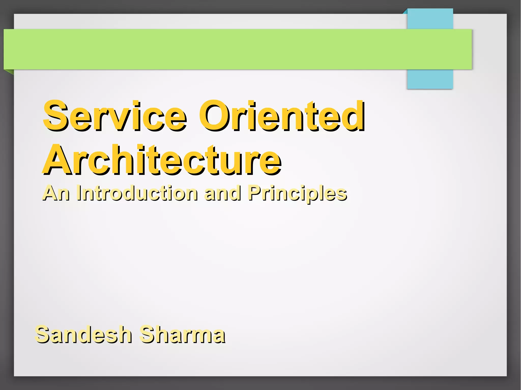 This document provides an introduction to service-oriented architecture (SOA). It discusses key concepts of SOA including loose coupling, implementation neutrality, and granularity. It explains that a service is an autonomous unit of automated business logic that is accessible to other systems. A SOA is a collection of services that are classified into types and layers and governed by architectural patterns and policies. The document outlines several principles for designing services, such as abstraction, reusability, composability, and autonomy.