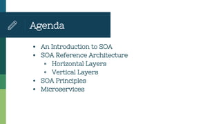 The document provides an overview of Service-Oriented Architecture (SOA), its principles, reference architecture, and the evolution towards microservices. It details the components, integration patterns, and types of services involved, including SOAP and RESTful web services. Additionally, it contrasts traditional SOA with microservices in terms of messaging, programming style, and deployment models.