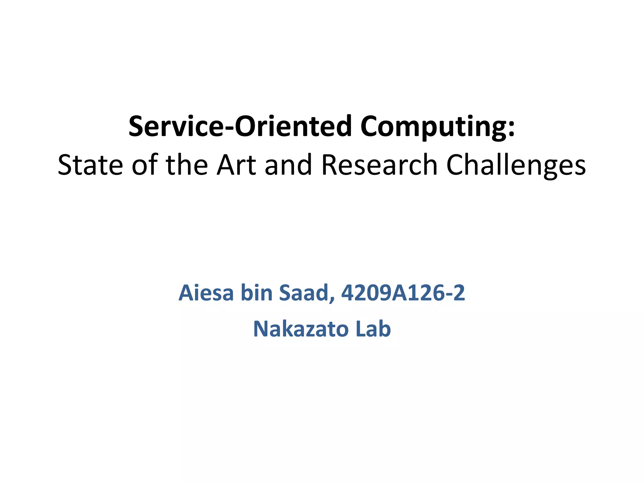 This document summarizes the state of research in service-oriented computing. It discusses key concepts like service-oriented architecture (SOA) and how it promotes assembling application components into a loosely coupled network of services. The document outlines research challenges in areas like service foundations (discovery, binding etc.), composition, management/monitoring, and design/development. It provides examples of the current state of research on topics like enterprise service buses, self-managing services, and engineering service applications.