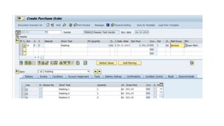 Service procurement involves creating a purchase order (PO) and service entry sheet (SES). The PO is created using transaction code ME21N, with account assignment categories and item category of "D" for services. Detailed service lines are entered in the item details/services tab. The SES is then created using transaction code ML81N, by entering the relevant PO number. The SES captures additional details for procurement and billing of the services.