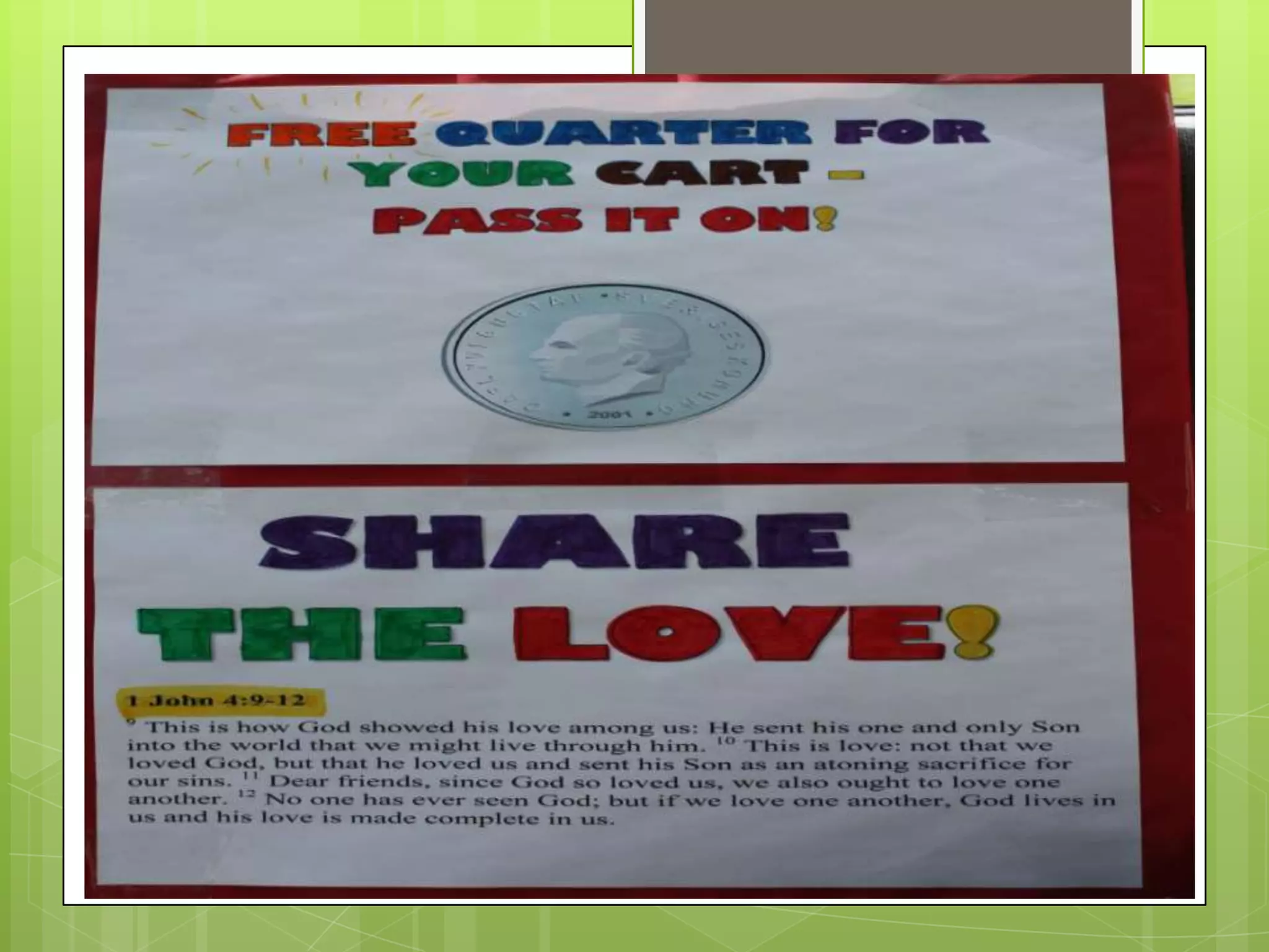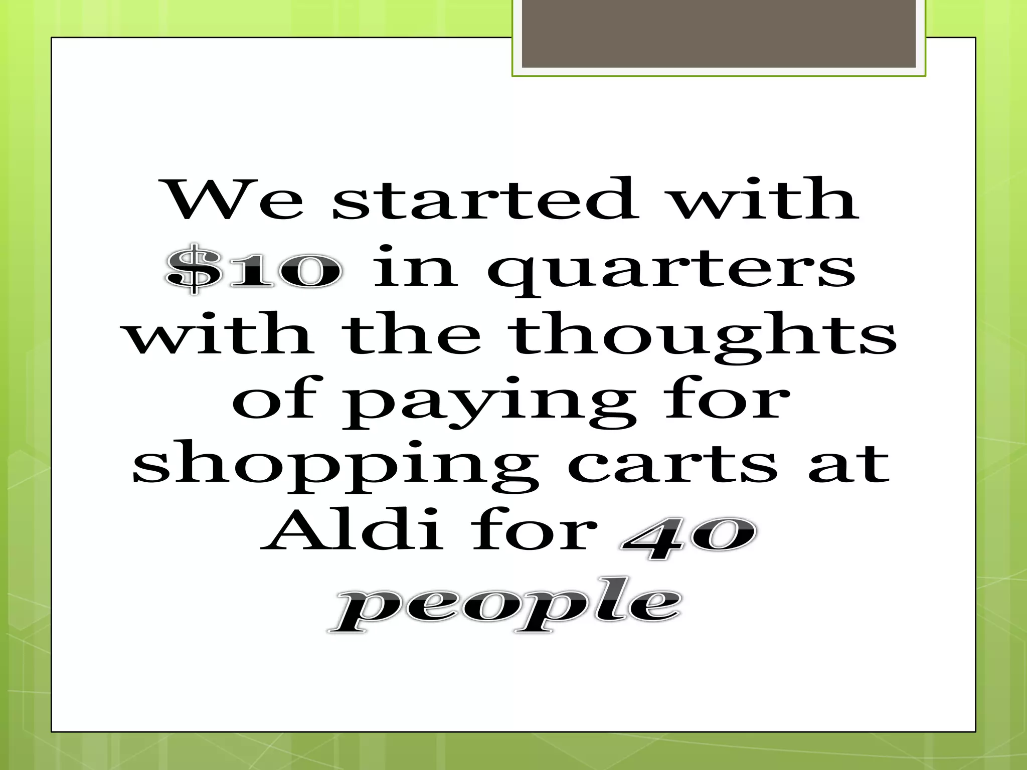 A group went to an Aldi grocery store to pay for people's shopping carts with quarters to demonstrate God's love. They saw people generously giving their carts of quarters to others with smiles and kindness. One man returned after leaving the store and gave the group $22 in quarters, which they used to anonymously pay for a family's groceries. The act of blessing others ended up blessing the group deeply and reflecting the Bible verse about giving generously.