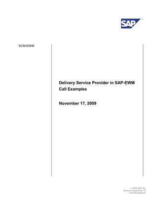 This document discusses delivery service providers in SAP EWM. It defines service providers and differentiates between UI service providers and delivery service providers. It provides an overview of the service architecture with the delivery business object and service provider in the middle. It also includes interfaces and examples of method calls for delivery service providers.