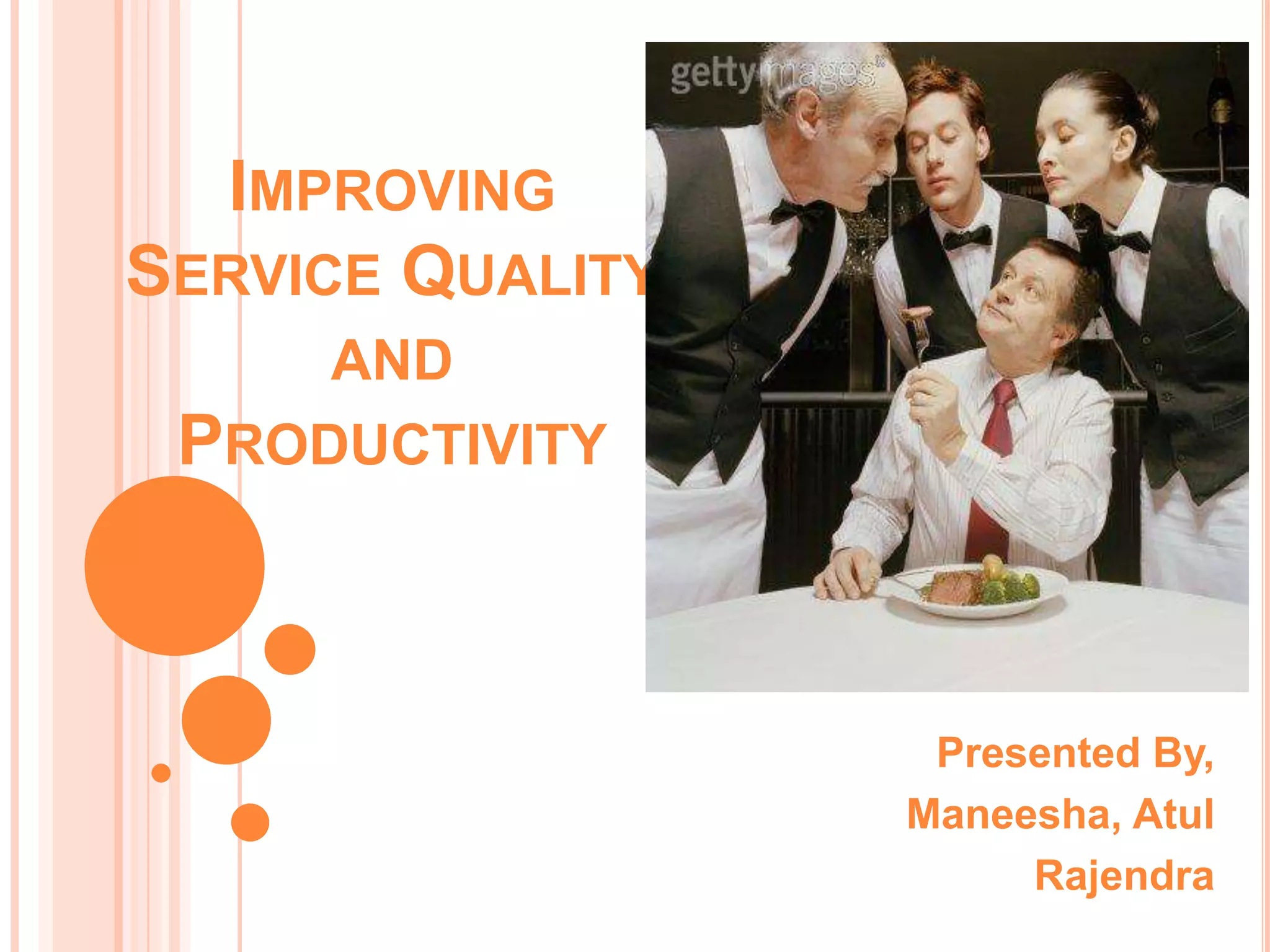 This document discusses improving service quality and productivity. It defines service quality from different perspectives and identifies key factors that influence customer expectations. The five components of service quality are discussed as well as SERVQUAL, a framework for measuring service quality gaps. Tools for measuring and addressing service quality problems are presented, including the gaps model, blueprinting, and cause-and-effect charts. Different types of demand and roles of employees that can influence customers are also summarized.