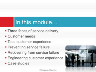 This document discusses customer service processes for airlines. It covers preventing service failures, recovering from failures, and engineering positive customer experiences. Some key points include: focusing on resolving customer issues and meeting their stated and unstated needs; apologizing and owning up to mistakes when failures occur; thinking creatively to resolve issues and soften negative impacts through communication; and making customers feel valued to build loyalty. The goal is to exceed expectations during normal service and turn dissatisfied customers happy again following any problems.