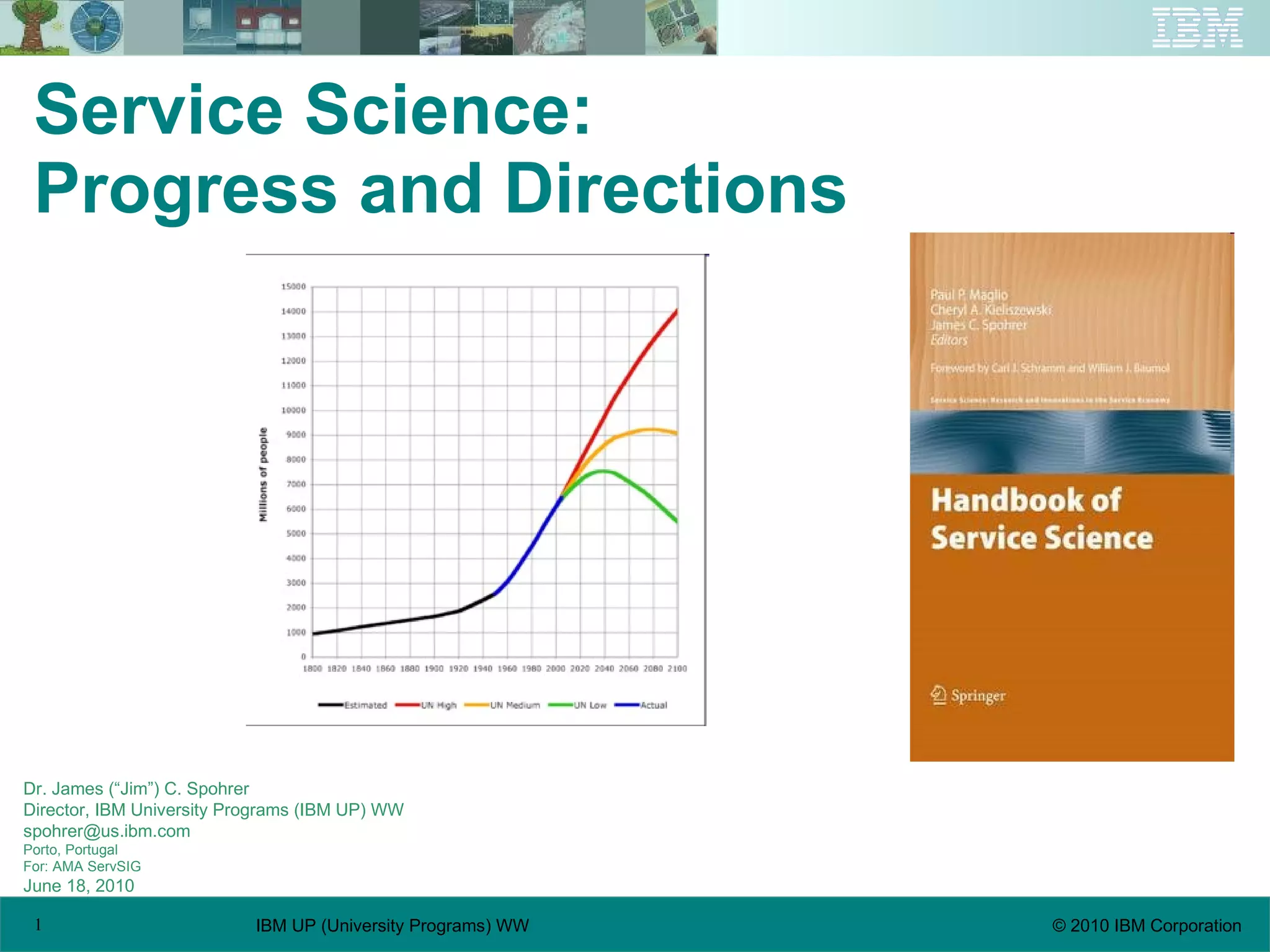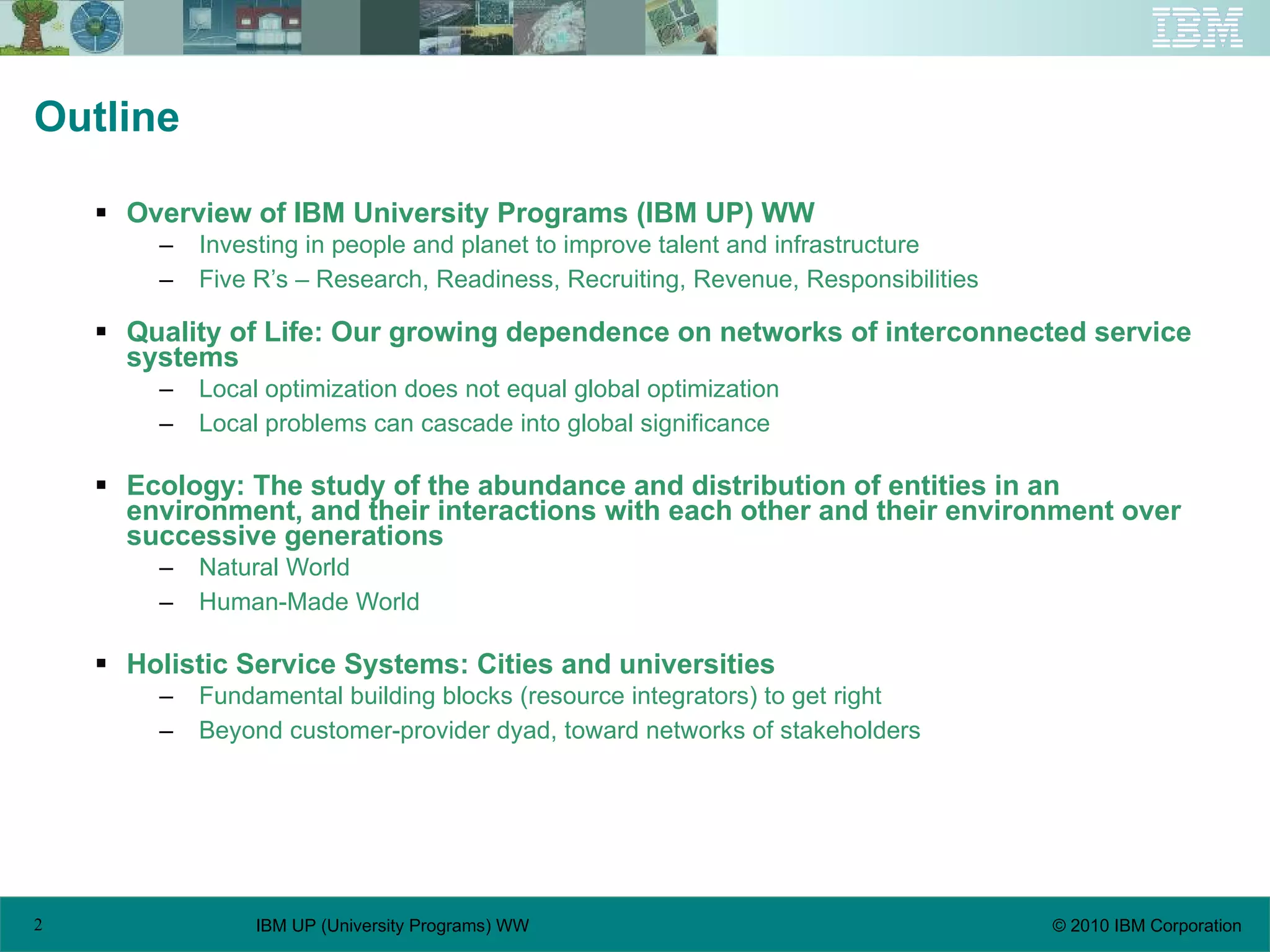 The document outlines IBM University Programs' strategies to enhance education and service systems through investments in people and environmental initiatives, focusing on five key areas: research, readiness, recruiting, revenue, and responsibility. It emphasizes the importance of building smarter cities and innovative service systems to improve quality of life, alongside fostering collaboration between universities and industry for better talent development. The initiative also highlights the need for transdisciplinary approaches in service science to address global challenges effectively.