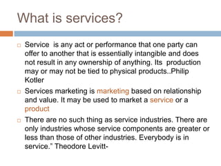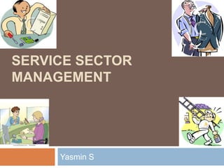 This document discusses service sector management and marketing. It defines services as intangible acts that do not result in ownership of a physical product. Services have characteristics like intangibility, perishability, and heterogeneity that differentiate them from physical goods. The growth of the service industry is driven by factors like increasing affluence, more leisure time, and a higher percentage of working women. The "moment of truth" refers to any customer interaction that forms an impression of service quality. Marketing challenges for services include intangibility, lack of physical evidence, and difficulty in brand management and competition. A service sector's business environment consists of internal factors and external micro and macro environmental factors.