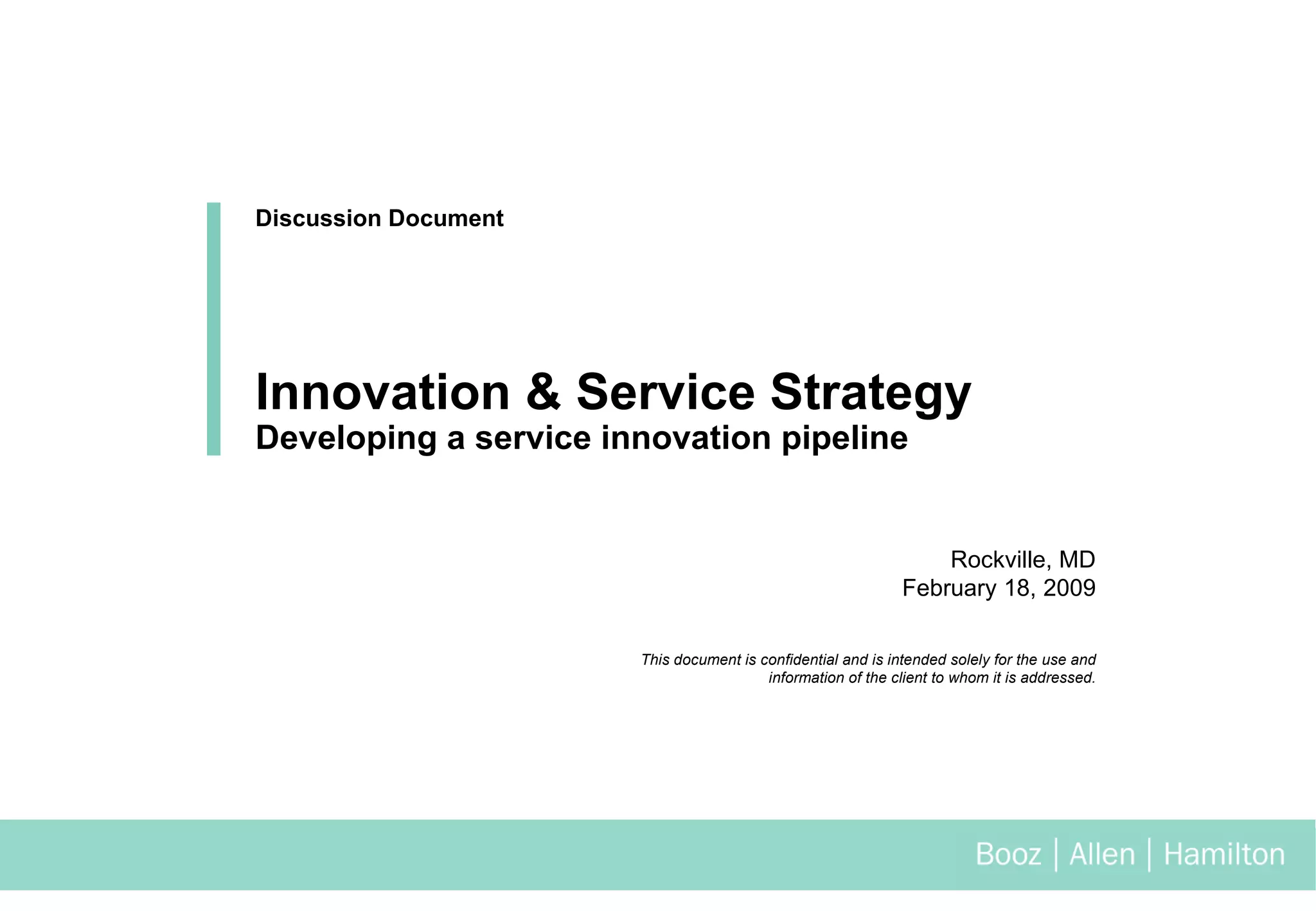 The document discusses service strategy and how it can help organizations pursue innovation and improve service management. It defines service strategy as focusing on delivering value to customers through new or improved services. The benefits mentioned include enhancing decision making, improving speed of change, and increasing value capture. Booz Allen's approach includes creating an innovation pipeline and portfolio management to evaluate new service ideas. Their offerings apply analytical techniques across the service lifecycle to optimize resources and improve financial management.