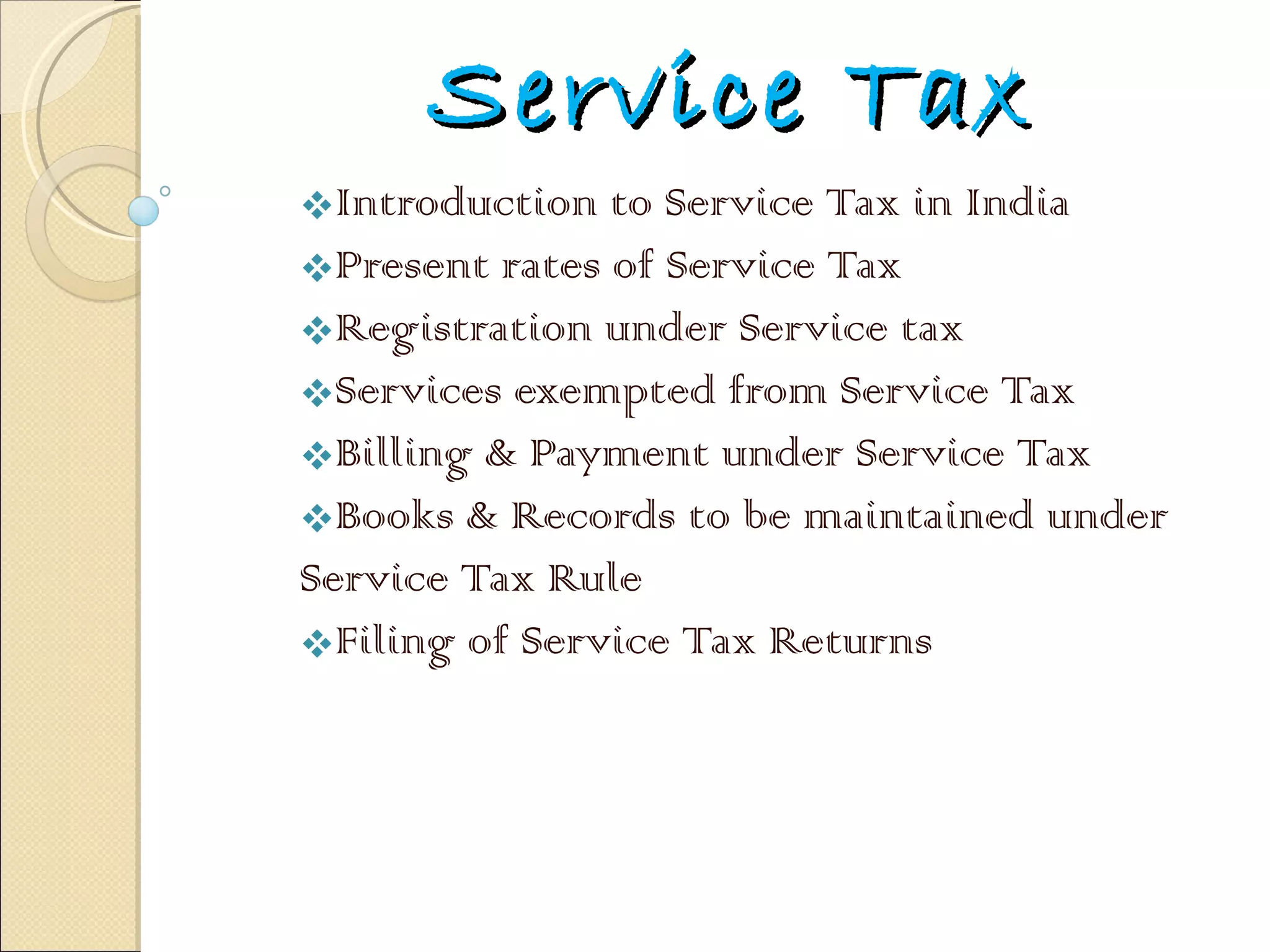 Service tax is a tax levied on service providers in India at a rate of 10.3% which includes a 10% service tax amount and 3% education cess on the service tax amount. Businesses providing taxable services exceeding Rs. 7 lakhs annually must register within 30 days by submitting Form ST-1 along with required documents. Certain services such as those provided to the UN or in special economic zones are exempted from service tax. Service providers with aggregate taxable services not exceeding Rs. 8 lakhs annually are also fully exempted. Invoice/bills for taxable services must be issued within 14 days and contain specified details, and service tax must be paid through specified banks using challan GAR