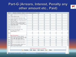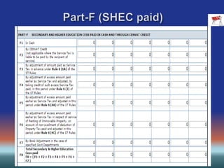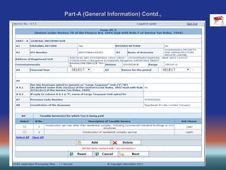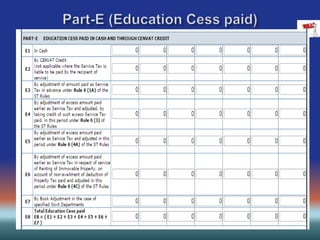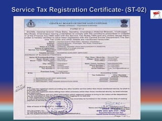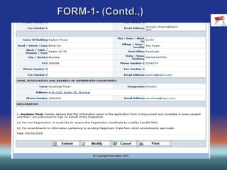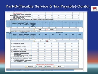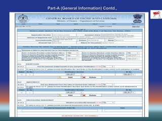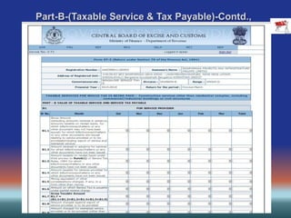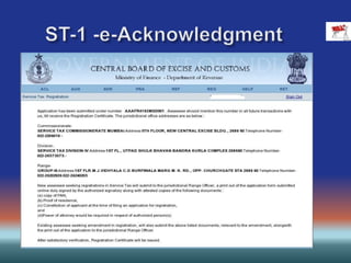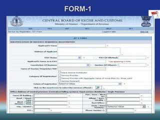 The document discusses various aspects of registration and e-filing procedures for service tax in India. It provides information on how to generate C forms automatically online, filing returns via form ST-3, registering for a service tax code, filing returns every six months, paying tax and interest for late payments. It also summarizes the various parts of form ST-3 and details around cenvat credit and input service distributors.