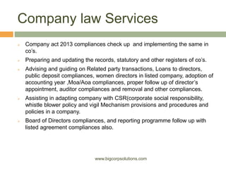 This document provides an overview of the various services offered by Big Corp Solutions, including company law services, financial and fundraising services, taxation services, SEBI compliance and listings, IPR services, legal and quasi-legal services, and legal representation services. The company appears to offer a wide range of services related to compliance, financing, taxation, intellectual property, and legal support for businesses.