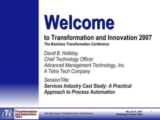 David B. Holliday, CTO of Advanced Management Technology, Inc. (AMTI), presented at the Business Transformation Conference, focusing on the company's approach to process automation and its profile as part of Tetra Tech with significant federal and commercial clients. The document outlines the company's revenue, notable projects, and a detailed overview of their internal processes and compliance challenges, including deficiencies in access control and system security. Recommendations for improvement emphasize the importance of tool selection, governance structure, and aligning projects with business goals.