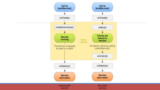 This document discusses services in Android. It defines what a service is, describes the different types of services (started, bound, foreground), and explains the service lifecycle methods like onCreate(), onStartCommand(), and onDestroy(). It provides examples of when to use a service versus a thread, and best practices for services like using a foreground service if the user is aware of it or duplicating functionality with scheduled jobs. The document also covers new limitations on background services in Android O.