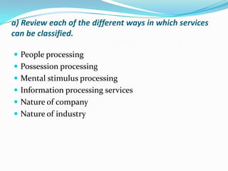 The document discusses different frameworks for classifying services and how they can be useful for managers. It provides examples of services that fall under each classification: people processing, possession processing, and mental stimulus processing. The document then asks the reader to list services they have used in the past month and categorize them. Finally, it discusses strategies marketers can use to help consumers evaluate services high in search, experience, and credence attributes to reduce perceived risk.