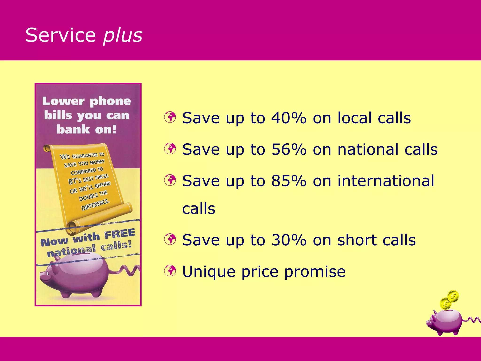 The document outlines the benefits of Service Plus, which offers significant savings on local, national, and international calls compared to BT services. Customers can install a smart box for free that maintains their existing number and line, while enjoying various features including a low minimum call charge and a 90-day money-back guarantee. Additionally, Mobile Plus provides affordable mobile plans with no minimum contract, free calls to Freephone numbers, and further savings for users.