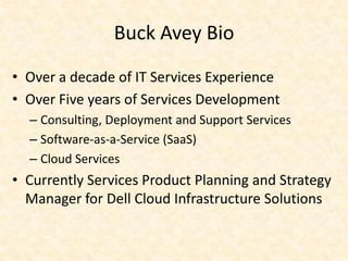 This document outlines five things to know about developing services products and provides tips for services strategy and development. It recommends having an overall services strategy, making services visible to customers, disciplining services through processes and standards, designing services that meet customer needs, and maintaining services over their lifecycle. The document is authored by an IT services expert and manager with over a decade of experience in consulting, deployment, support and software-as-a-service.