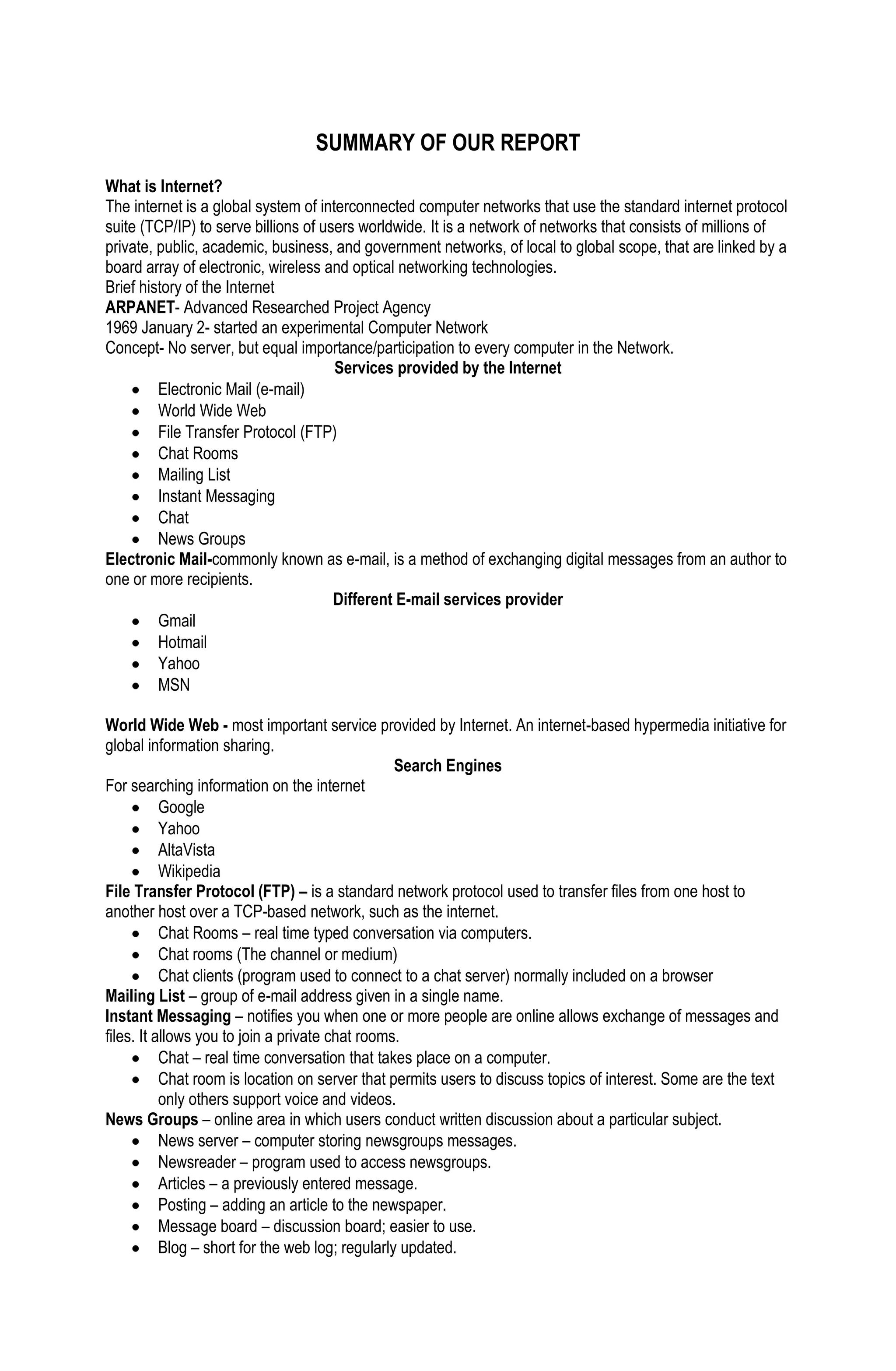 The internet is a global system of interconnected computer networks that use TCP/IP to connect billions of users worldwide. It consists of private, public, academic, business, and government networks linked together using various networking technologies. The Advanced Research Projects Agency Network (ARPANET) in 1969 is seen as the beginning of the internet. Key services provided by the internet include electronic mail, the World Wide Web, file transfer protocol, chat rooms, mailing lists, instant messaging, and newsgroups. These services allow users to communicate and share information online.
