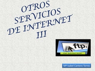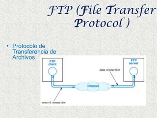 El documento describe varios servicios de Internet como FTP, que permite el intercambio de archivos entre servidores y ordenadores usando un cliente y servidor FTP, P2P que permite el intercambio directo de información entre pares aprovechando el ancho de banda, y los programas P2P Ares y LimeWire que permiten la búsqueda, previsualización y descarga de archivos de forma sencilla y rápida entre usuarios.