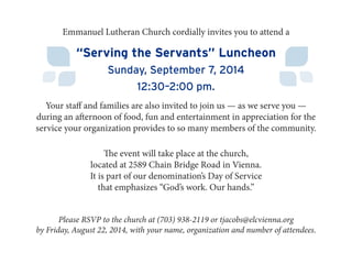 Emmanuel Lutheran Church invites local nonprofit organizations and officials to a "Serving the Servants" Luncheon on September 7, 2014 from 12:30-2:00 pm. The church congregation will serve and honor guests from organizations like Our Daily Bread and FACETS that help less fortunate community members. As part of the Lutheran denomination's Day of Service emphasizing "God's work. Our hands", the afternoon will include food, fun, and entertainment. RSVPs are requested by August 22 to the church located at 2589 Chain Bridge Road in Vienna.