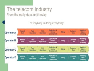 The document discusses industrializing telecom services and the changing telecom services market. It notes that the core telecom services market has changed with new services and competition emerging. This has led to issues like commoditization and declining profits for carriers. It suggests that carriers can transform by becoming converged services providers that aggregate both core and external services. A federated services delivery model is proposed to help carriers avoid time-to-market issues and allow for localized delivery of universal services through partners.