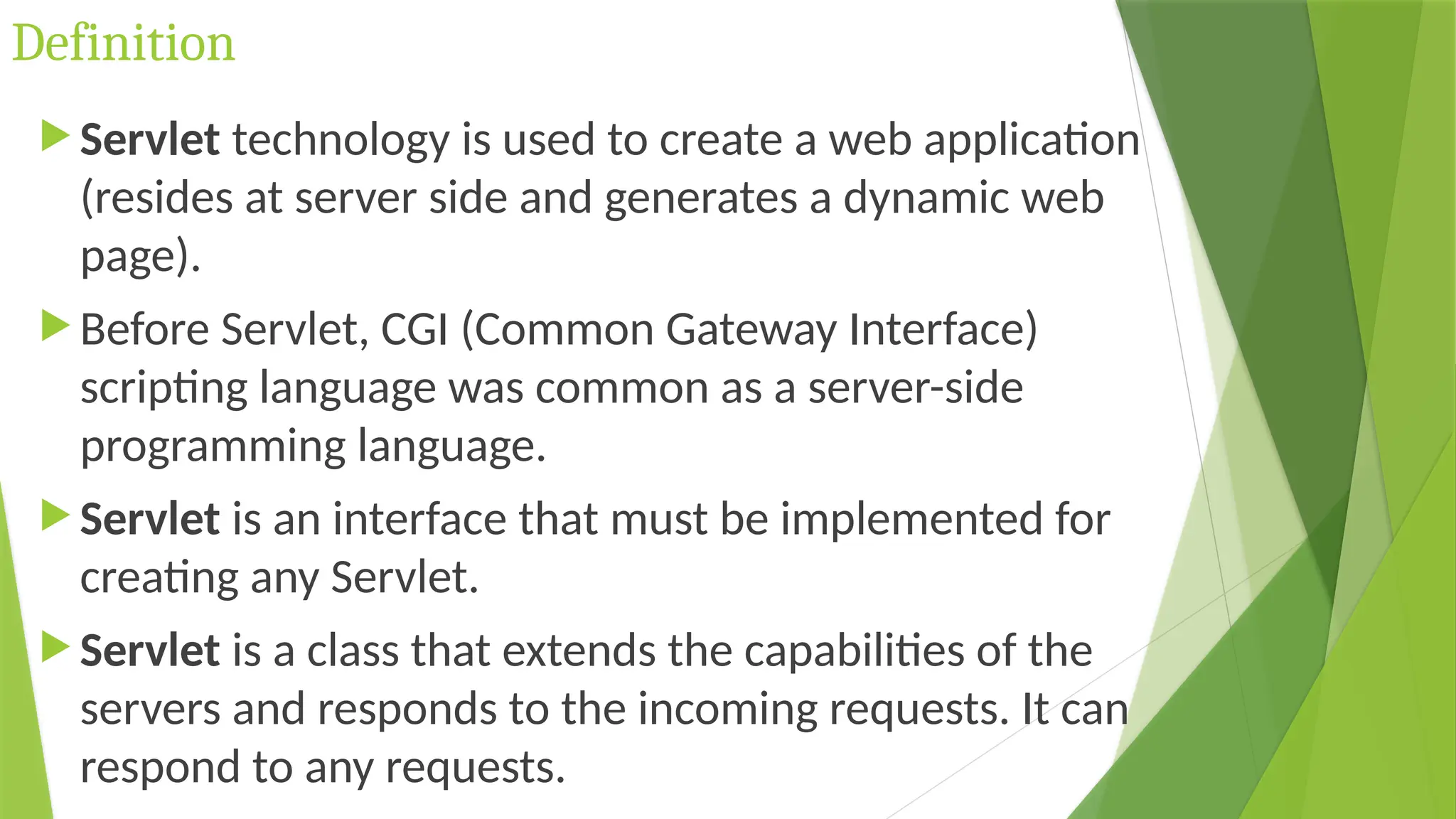 The document provides a detailed overview of Java Servlets, their architecture, lifecycle, advantages over CGI, and methods for creating servlets using different classes such as GenericServlet and HttpServlet. It explains how servlets handle requests, the roles of servlet containers, and the deployment descriptor (web.xml). Additionally, it describes the differences between static and dynamic websites and provides examples of invoking servlets from HTML forms.