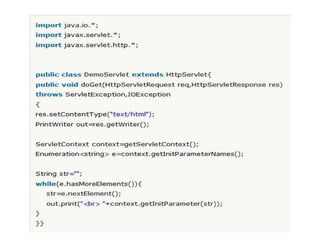 The document provides an overview of servlets and related technologies. It discusses that servlets are Java programs that run on a web or application server, process client requests, and produce dynamic web pages. Servlets act as a middle layer between requests from browsers/clients and databases on the server. The document also covers common gateway interface (CGI), GET and POST methods, query strings, advantages of servlets over CGI, the servlet API, servlet lifecycle, session tracking techniques including cookies, and examples of using cookies to track sessions.