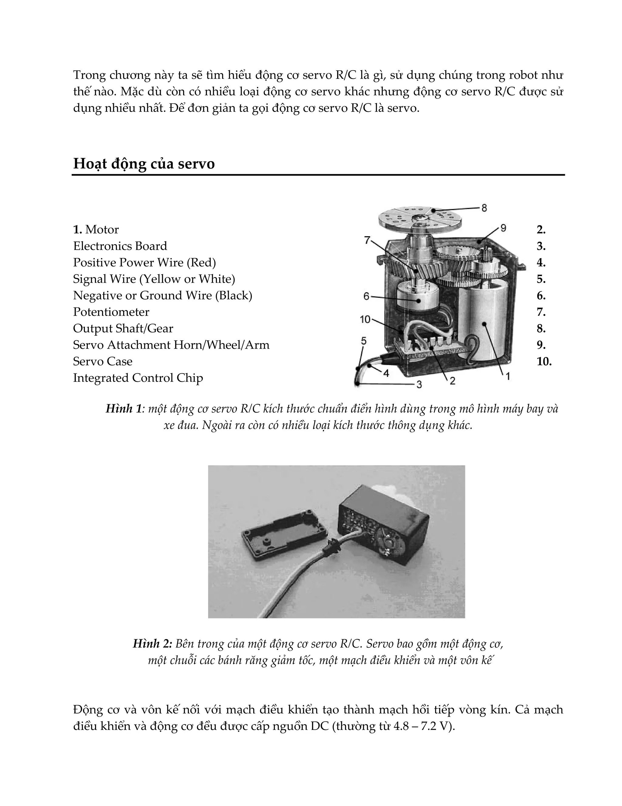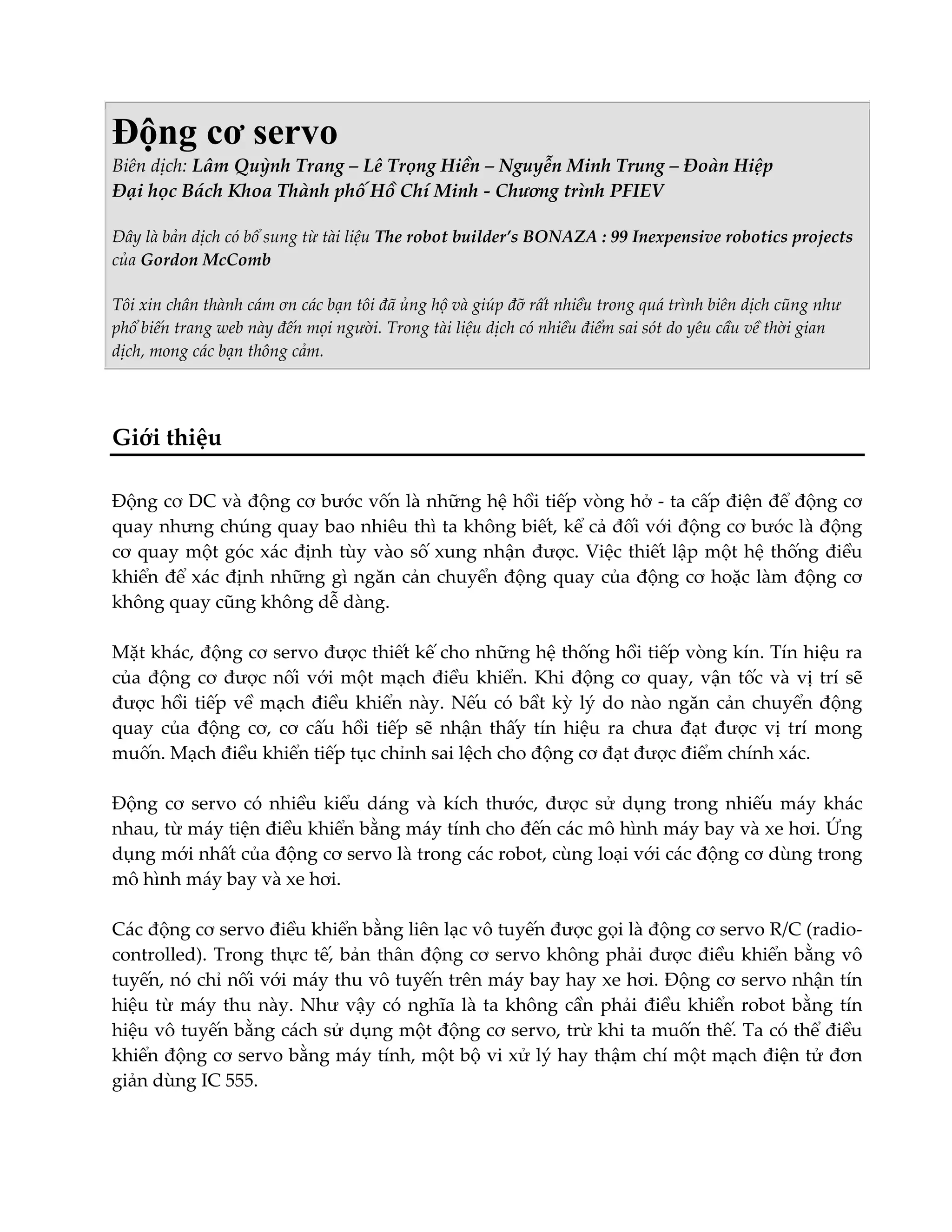 Tài liệu này giới thiệu động cơ servo, một thành phần quan trọng trong hệ thống điều khiển hồi tiếp vòng kín, thường được sử dụng trong robot và mô hình máy bay. Nó giải thích cách thức hoạt động của động cơ servo, cách điều khiển thông qua tín hiệu điện và vai trò của các linh kiện bên trong động cơ. Cuối cùng, tài liệu cũng đề cập đến các loại servo khác nhau và ứng dụng của chúng trong các dự án robotics.