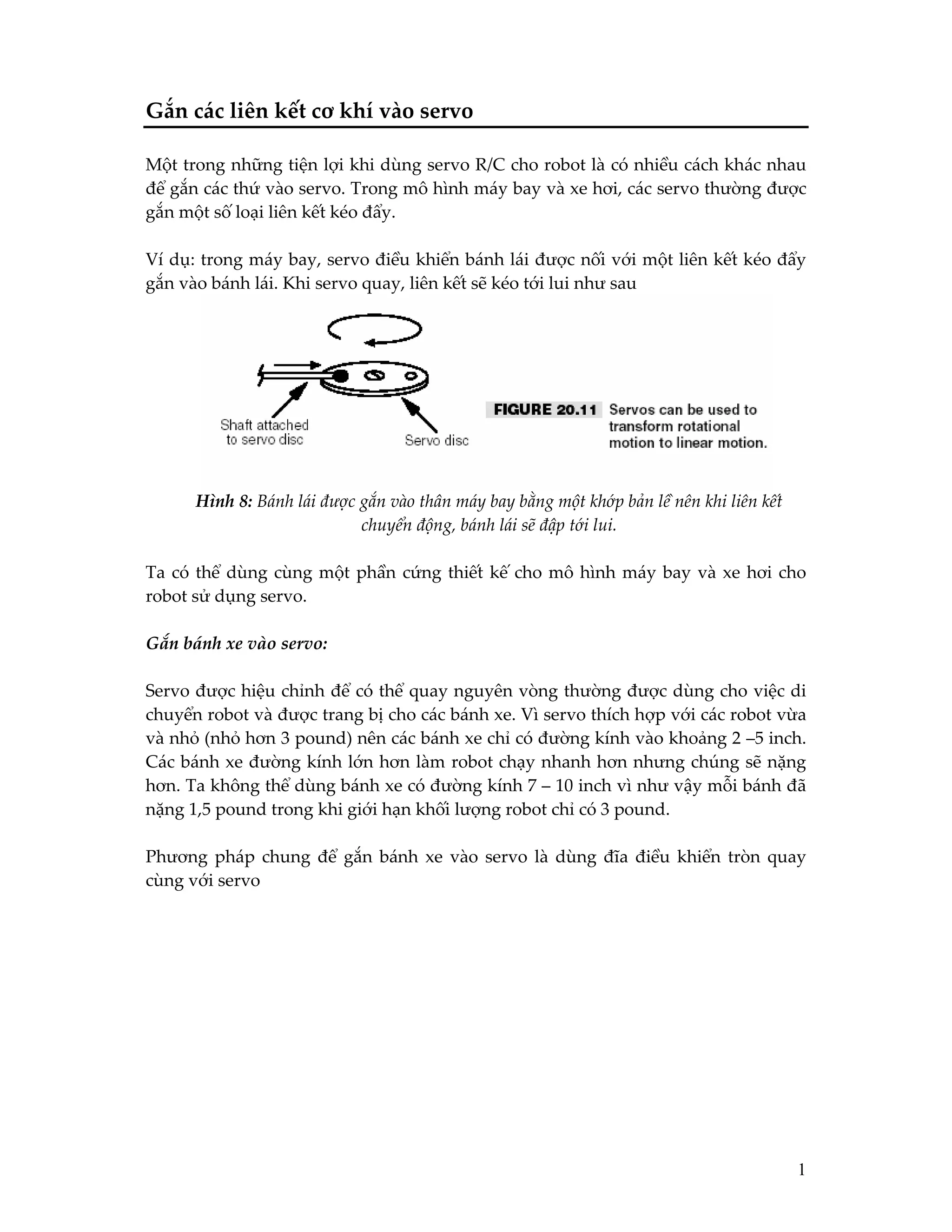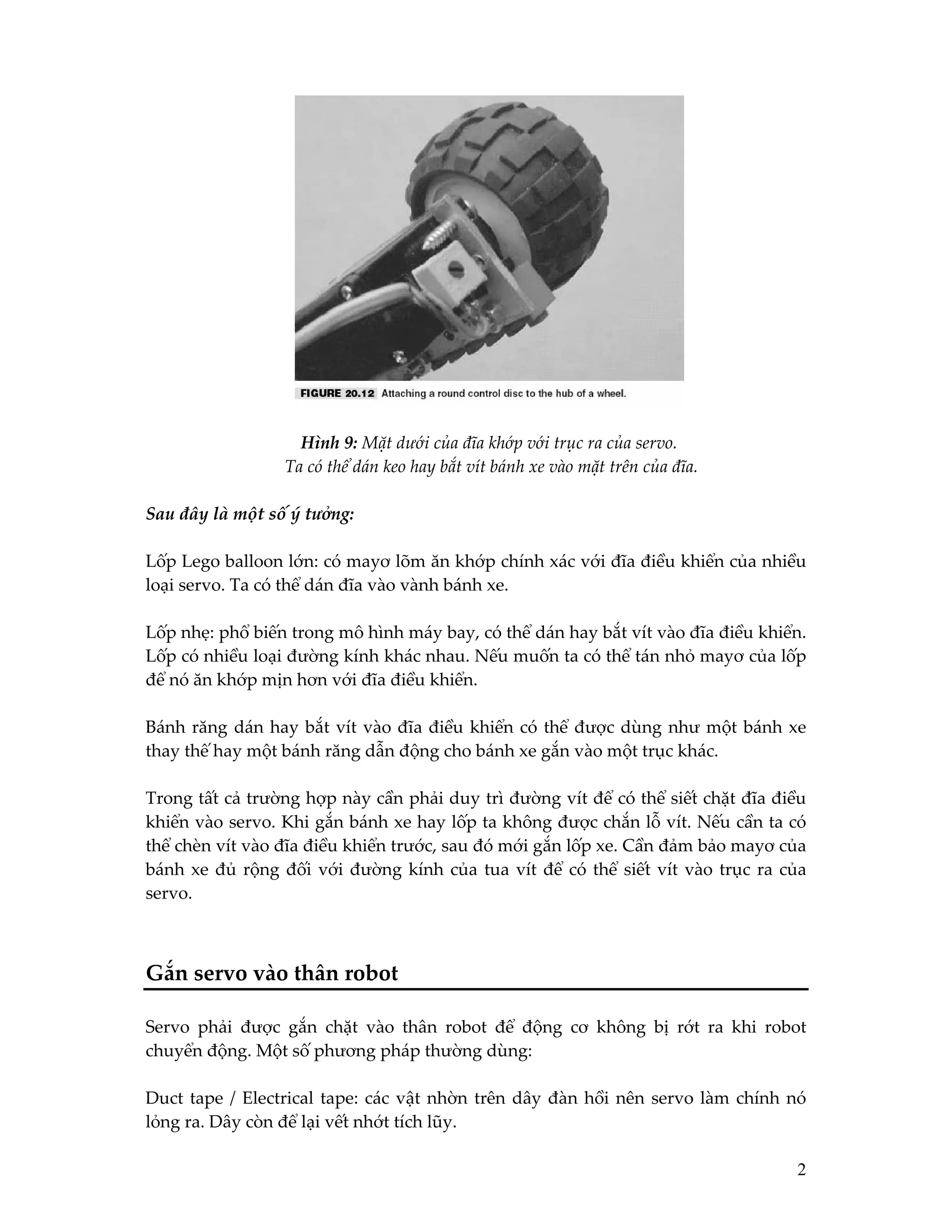 Tài liệu mô tả cách gắn các liên kết cơ khí vào servo trong robot, với nhiều phương pháp khác nhau bao gồm sử dụng tape, buộc chặt bằng dây hoặc gắn bằng keo. Nó cũng cung cấp hướng dẫn về cách gắn bánh xe vào servo và cách điều khiển servo bằng máy phát chức năng hoặc handy board. Cuối cùng, tài liệu trình bày mã lập trình mẫu để điều khiển servo và hiển thị góc quay trên màn hình.