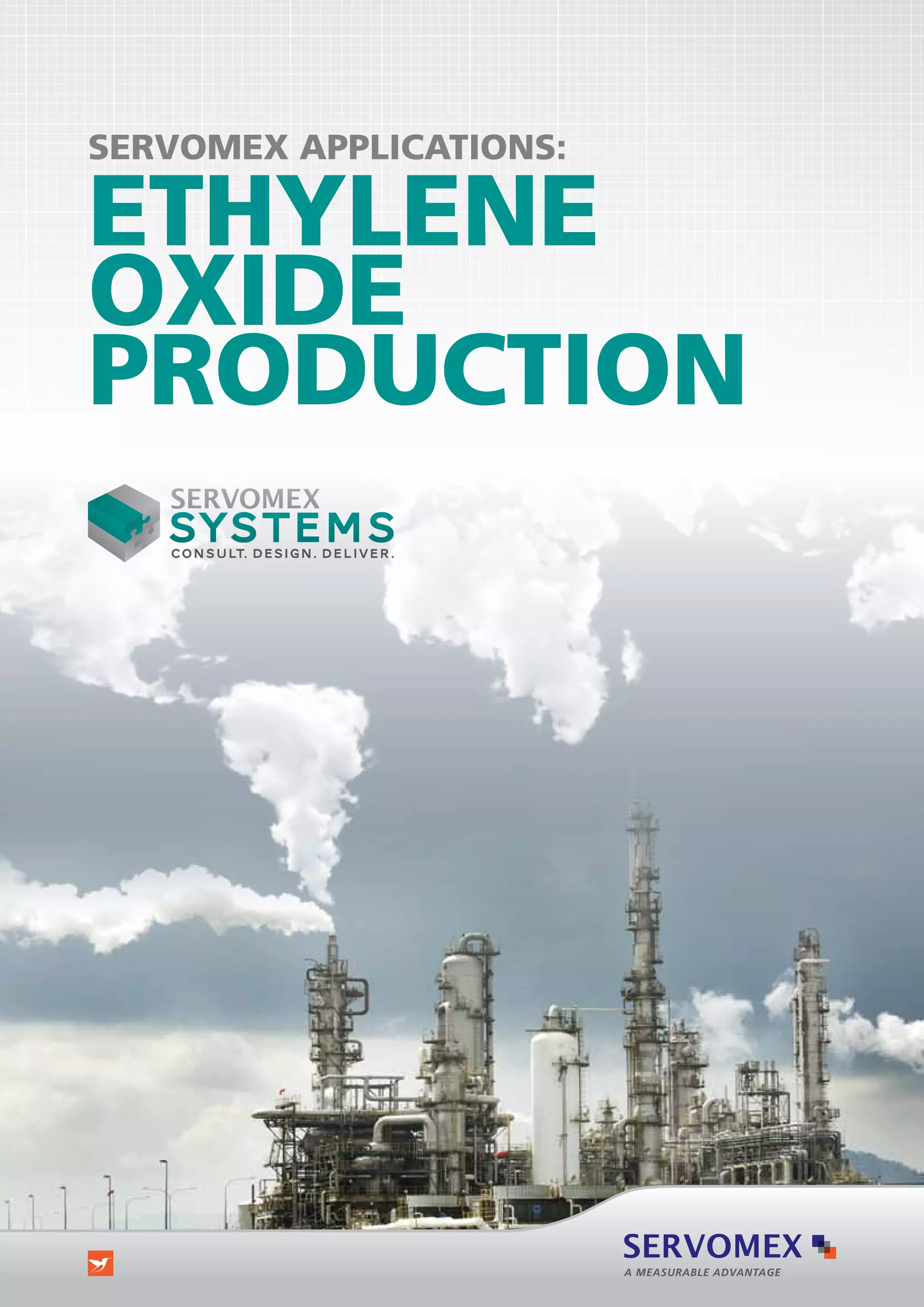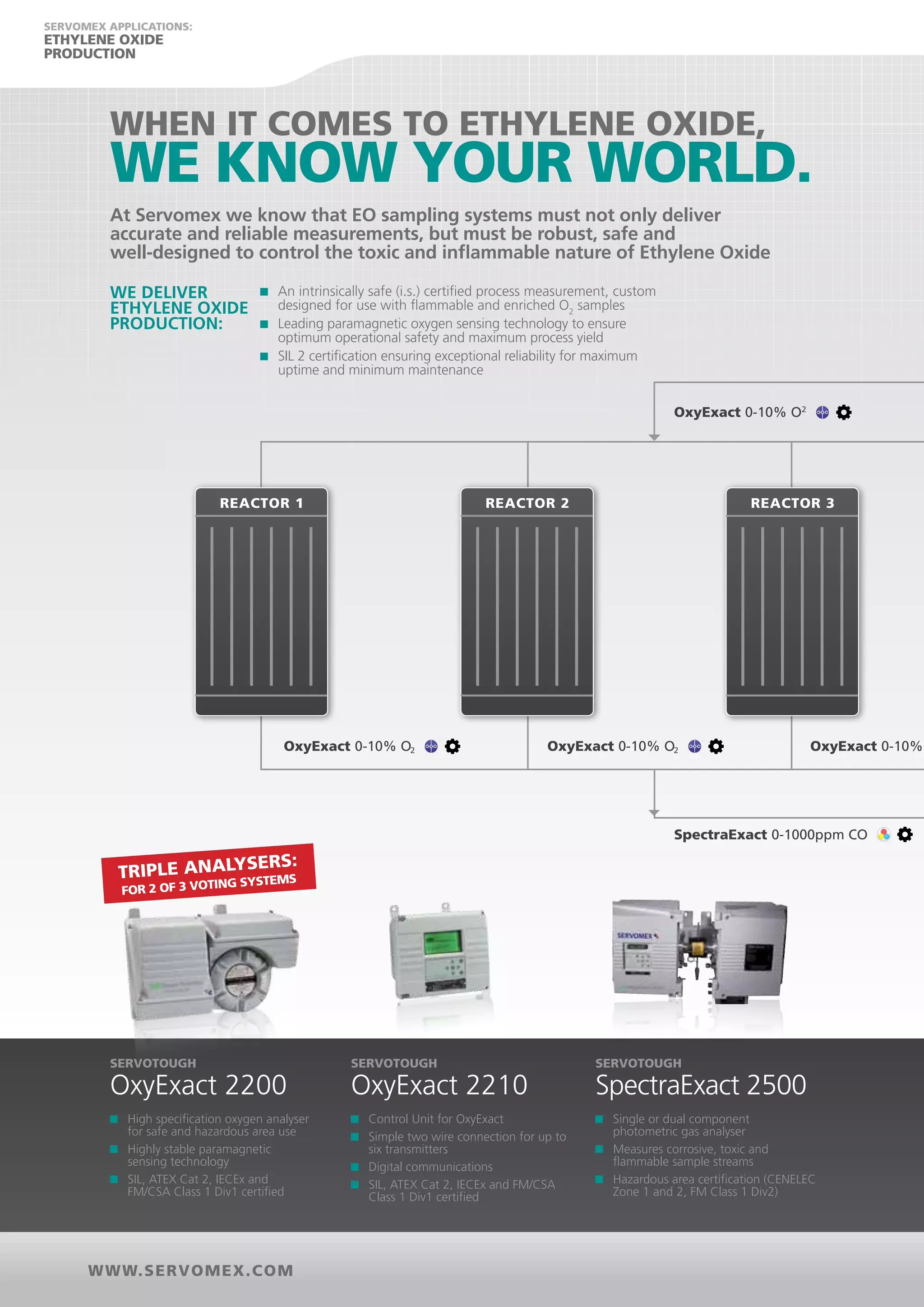 Servomex provides measurement systems for ethylene oxide production that ensure safety and maximize process yield. Their systems use paramagnetic oxygen sensing technology and hazardous area certifications. They offer intrinsically safe analyzers, control units, and photometric gas analyzers to monitor oxygen and ethylene levels in multiple reactors and throughout the ethylene oxide production process.