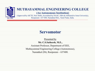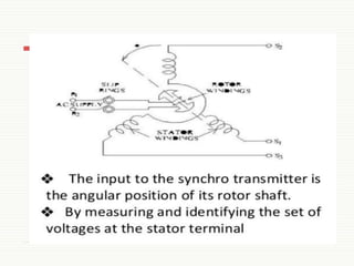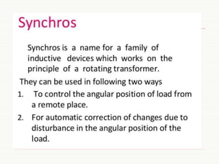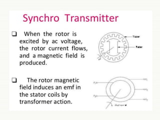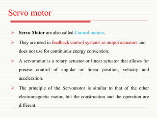 The document discusses servomotors, explaining their definition, construction, operational principles, and classifications into AC and DC types. It highlights their applications in various fields such as robotics, radar systems, and machine tools, emphasizing their precise control capabilities and fast torque response. Additionally, it covers the types of synchro systems related to servomotors and their advantages.