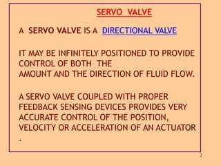 A servo valve is a directional control valve that can be precisely positioned using an electrical signal to control the amount and direction of fluid flow. Coupled with sensors, servo valves provide very accurate control of position, velocity, or acceleration. Compared to proportional valves, servo valves use closed-loop control for higher accuracy and frequency response but require cleaner fluid and more maintenance. Servo valves are the most sensitive to contamination and require fluid cleanliness of 5 microns or less.