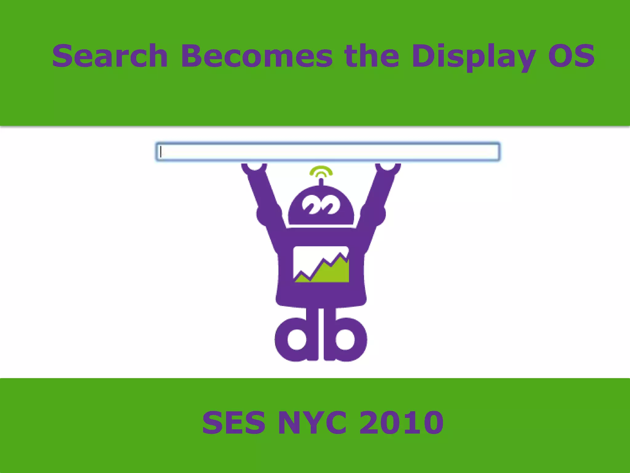 The document discusses how search is becoming the operating system for display advertising. It argues that lessons from search, like relevance and intent, need to be applied to display for it to be effective. Specifically, it says display needs to shift from bulk impressions to an approach focused on segmentation, targeted creative, automated buying, and ongoing optimization of campaigns based on data. The goal is for display to evolve from the current "golden shower" approach to a new "golden triangle" model based on search advertising techniques.