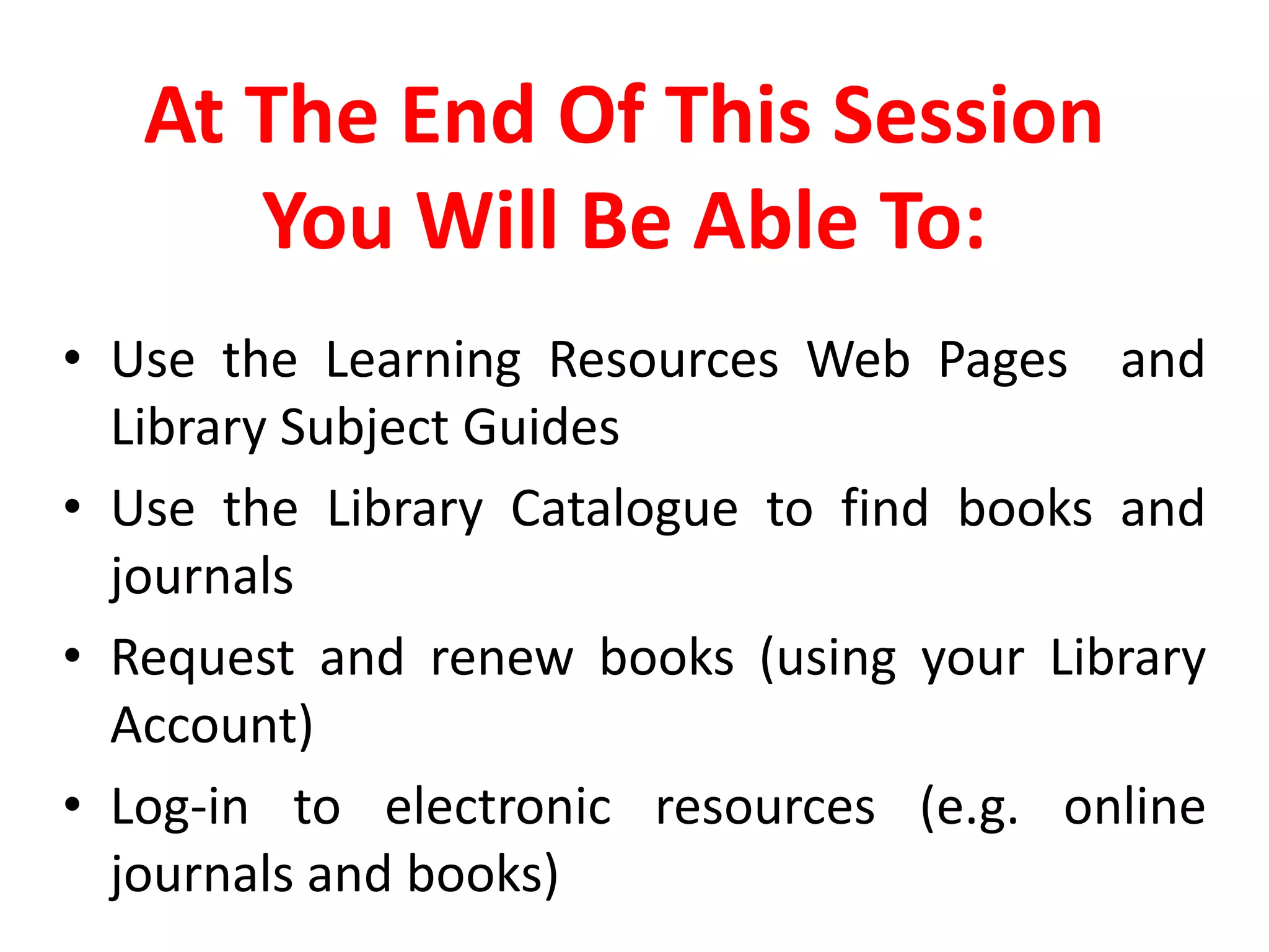This document provides an overview of essential library skills, including how to use the library catalog to find and request books and journals, log into electronic resources, renew books online, and find journal articles. It demonstrates how to search the catalog for specific book and journal examples and access full text journal articles. Useful links are provided for the learning resources webpages, a subject guide for sport and exercise science resources, and asking librarians for assistance.