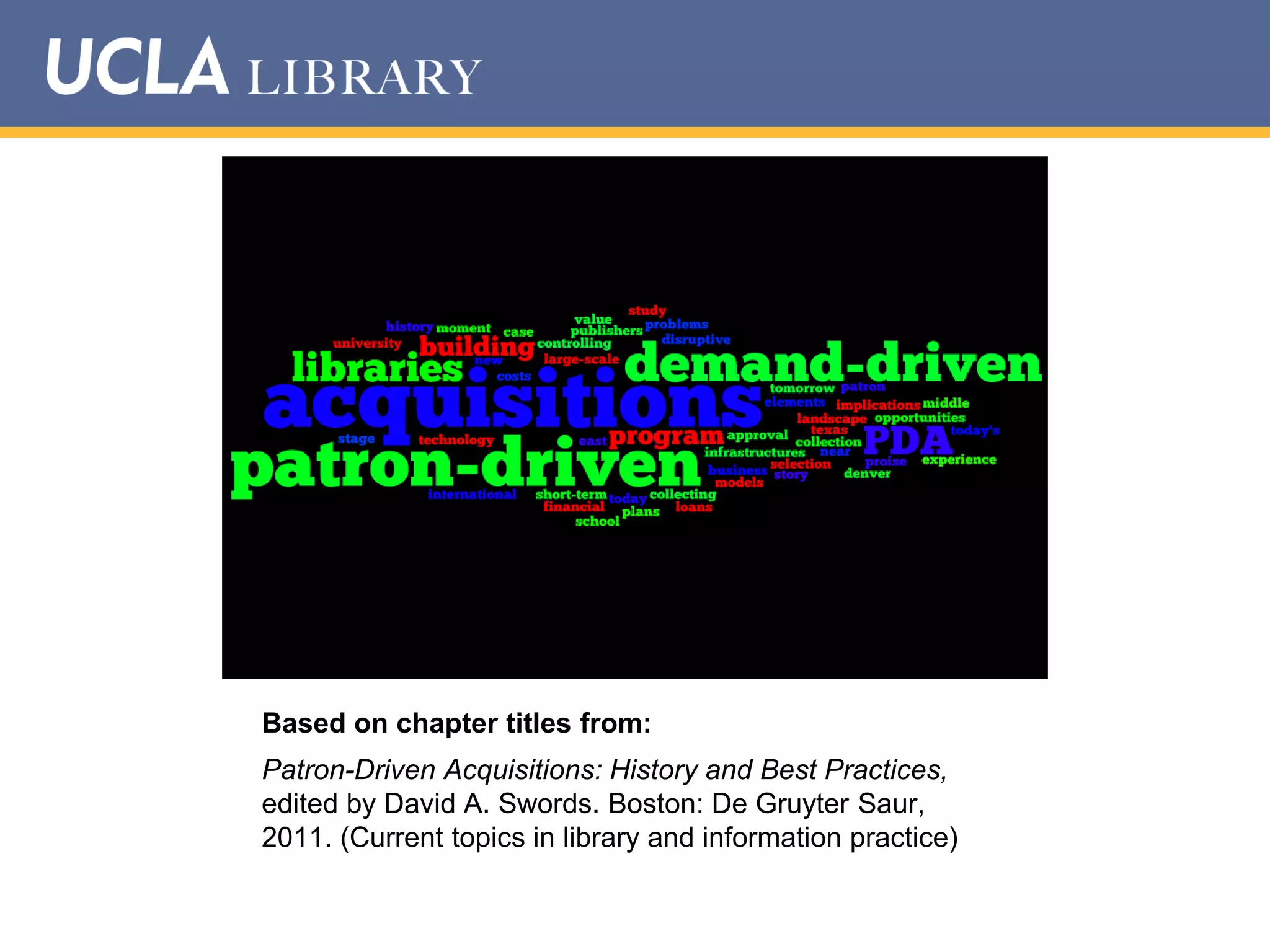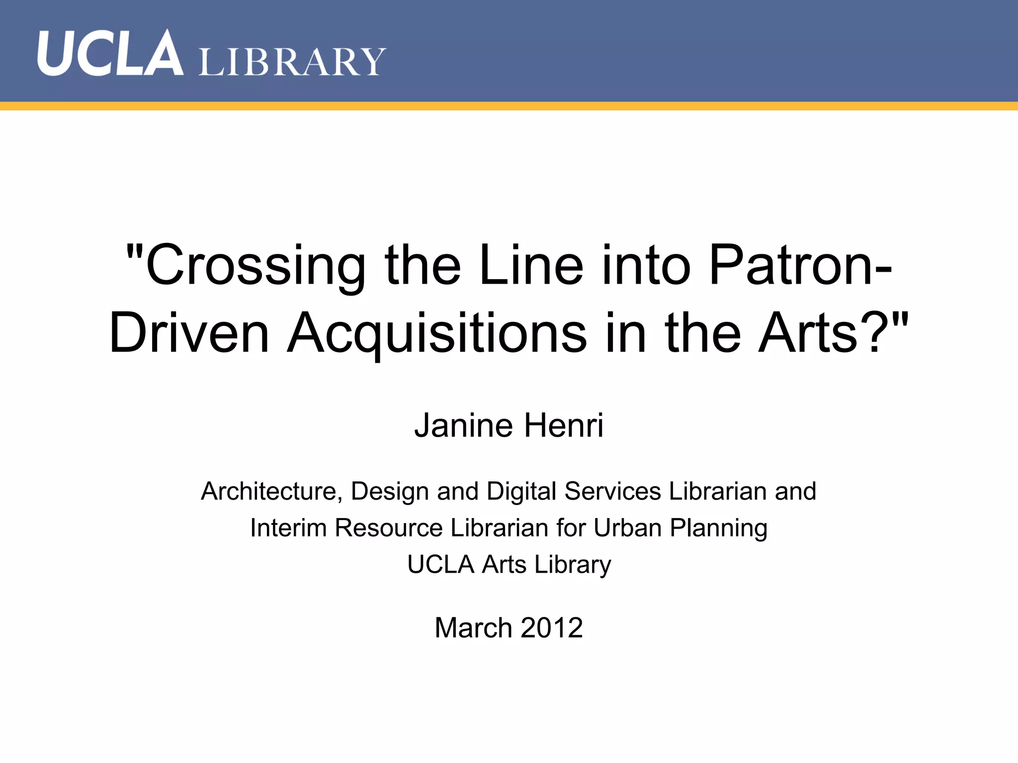 The document discusses patron-driven acquisitions (PDA) in library collections, particularly in the arts and design fields, using UCLA's pilot program as a case study. It highlights the importance of community participation in librarianship, the limitations of current catalog records for designers, and potential impacts on student exposure to diverse visual resources. Additionally, it raises concerns about faculty investment in library collections and the future of librarian roles in curating knowledge.