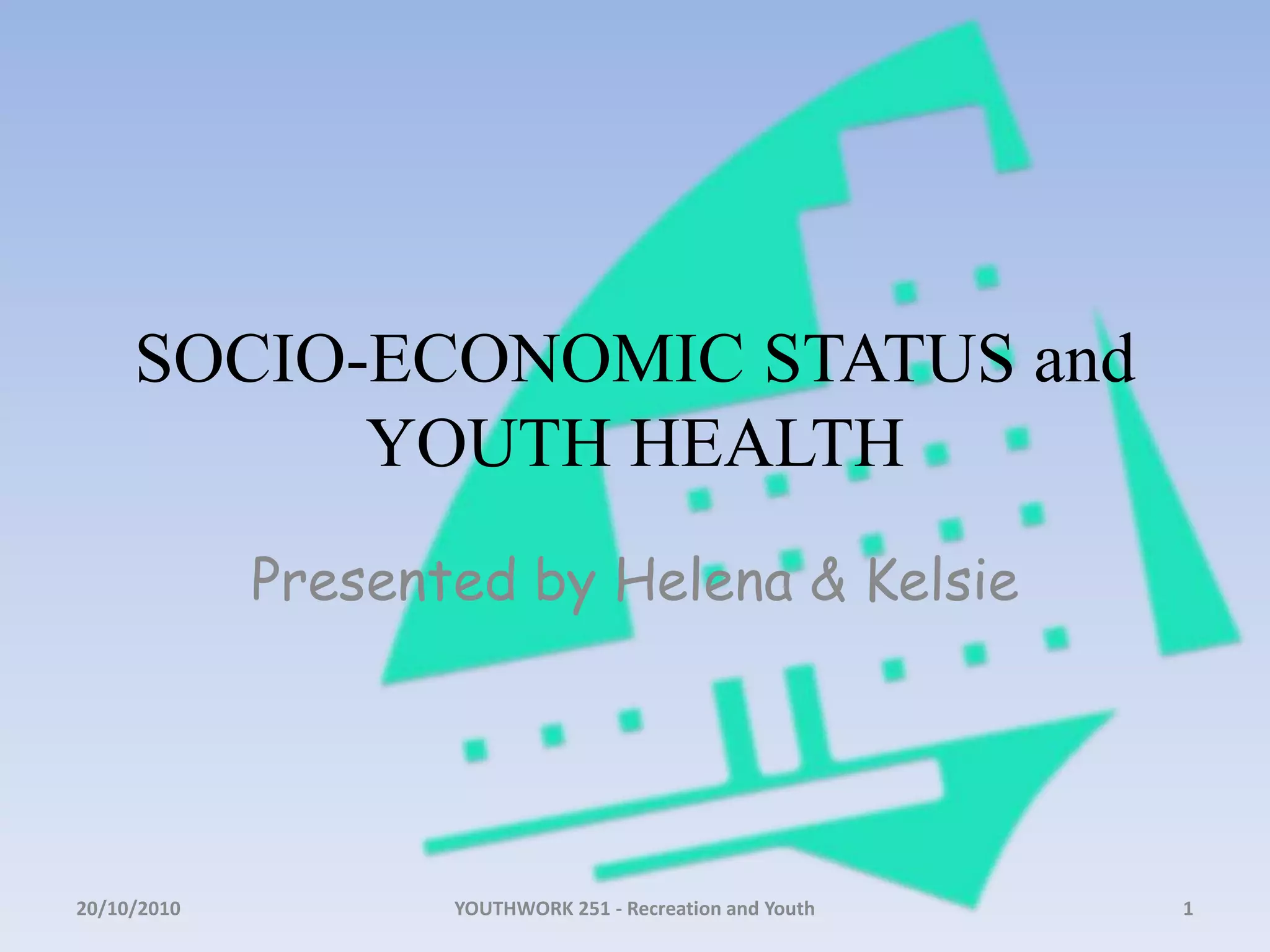 This document discusses the relationship between socio-economic status and youth health. It defines key terms like youth, socio-economic status, income, education, health, and physical activity. Lower socio-economic status can negatively impact youth health through limited access to nutritious food, health information, and medical care due to lower income and education levels. Cultural factors also influence dietary behaviors for some youth. Overall, socio-economic status is an important determinant of youth health.