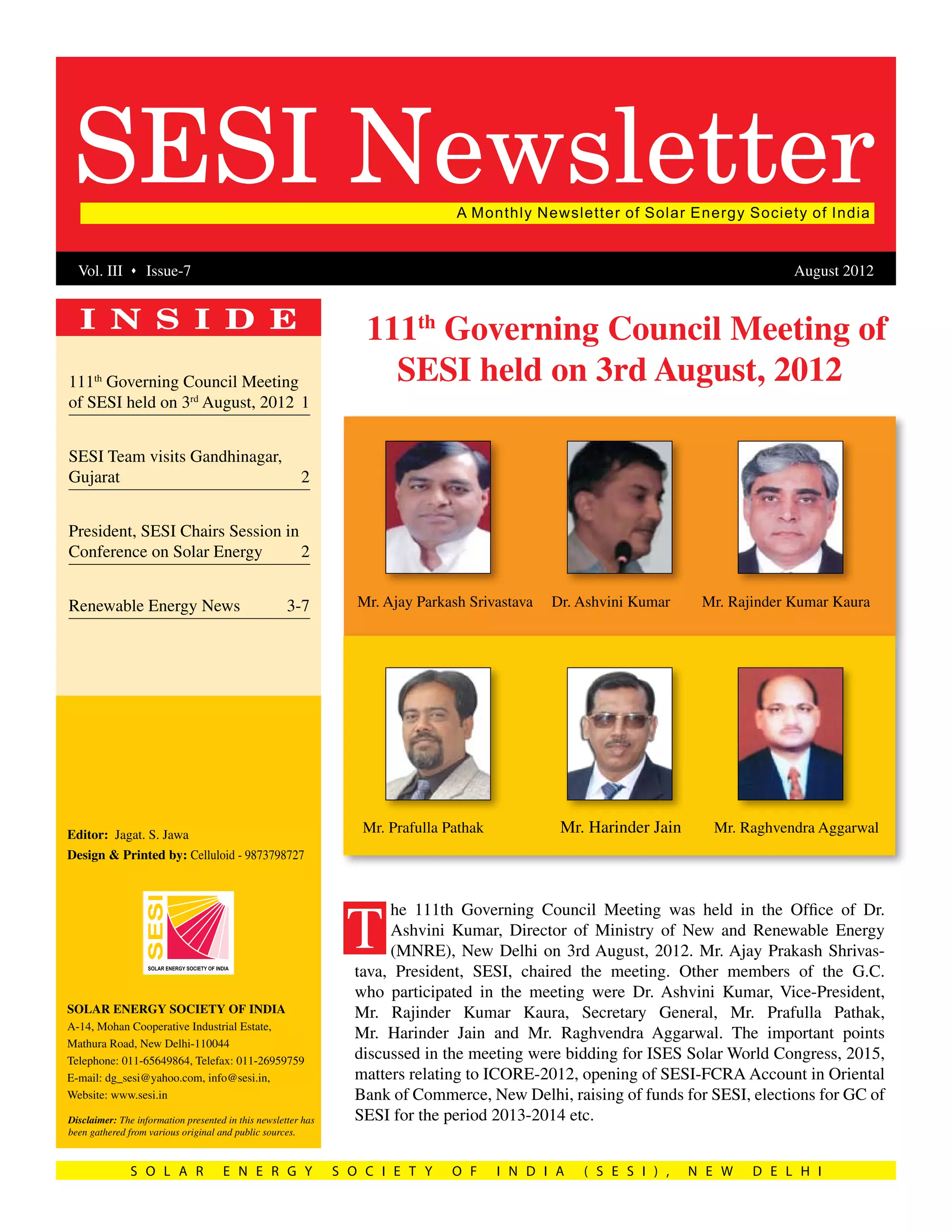 The 111th Governing Council Meeting of the Solar Energy Society of India (SESI) was held on August 3rd, 2012 in New Delhi. Key topics discussed included bidding for the 2015 International Solar World Congress, preparations for the International Congress on Renewable Energy in December 2012, and elections for the SESI Governing Council in 2013-2014. Additionally, an SESI team visited Gandhinagar, Gujarat to discuss hosting the Congress and met with state government officials who pledged their support. The President of SESI also chaired a session at a conference on solar energy in New Delhi.