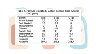 Dokumen ini menjelaskan tentang lotion sebagai sediaan topikal dengan berbagai fungsi, termasuk melembabkan kulit dan memberikan pengobatan dermatologis. Lotion dapat berupa emulsi, digunakan untuk aplikasi obat, dan memiliki bahan aktif yang meliputi vitamin dan humektan. Proses pembuatan lotion melibatkan pemanasan dan pengadukan fase minyak dan air, serta evaluasi fisik seperti uji pH dan viskositas.