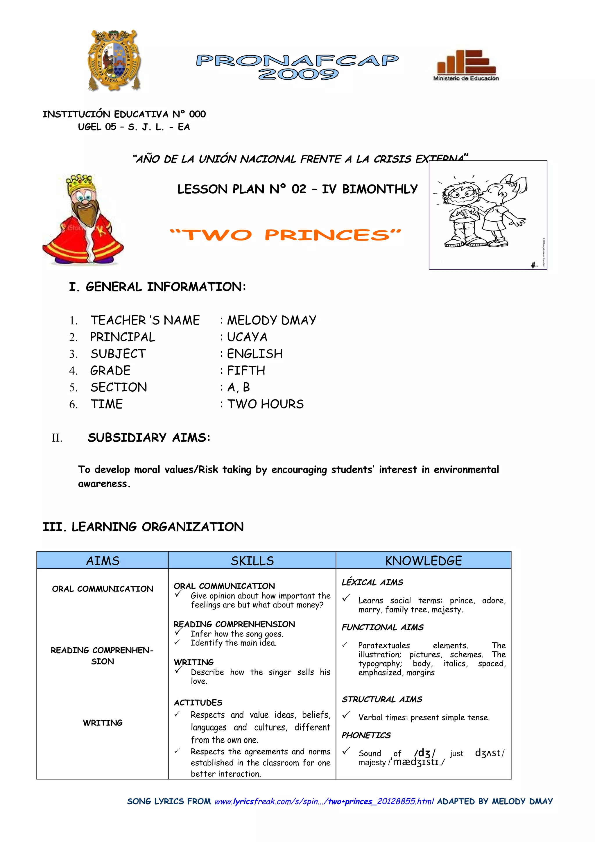 The document contains a lesson plan for a 5th grade English class. It includes details like the teacher's name, subject, and time allotted. The lesson plan aims to develop moral values and environmental awareness. Students will read lyrics from the song "Two Princes" and work on skills like oral communication, reading comprehension, and writing. Activities include previewing vocabulary, listening to the song, answering questions about it, and drawing a picture. Students will be assessed on reading comprehension, oral communication, and attitudes/values.