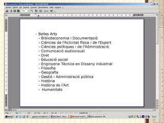 Part Diversificada OPTATIVESSegona Ll. Estrangera Ampliació de matemàtiques Biologia Humana Electrònica Estada a l’empresa Estètica Expressió vocal Formació laboral BATXILLERAT HUMANÍSTIC -SOCIAL Història de CAT Informàtica Literatura Universal Lògica i metodologia Psicologia Simbologia religiosa Sociologia