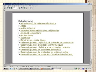 BATXILLERAT CIENTÍFIC TECNOLÒGICPart Diversificada OPTATIVES Segona Ll. Estrangera Ampliació de matemàtiques Biologia Humana Electrònica Estada a l’empresa Estètica Expressió vocal Formació laboral Història de CAT Informàtica Literatura Universal Lògica i metodologia Psicologia Simbologia religiosa Sociologia