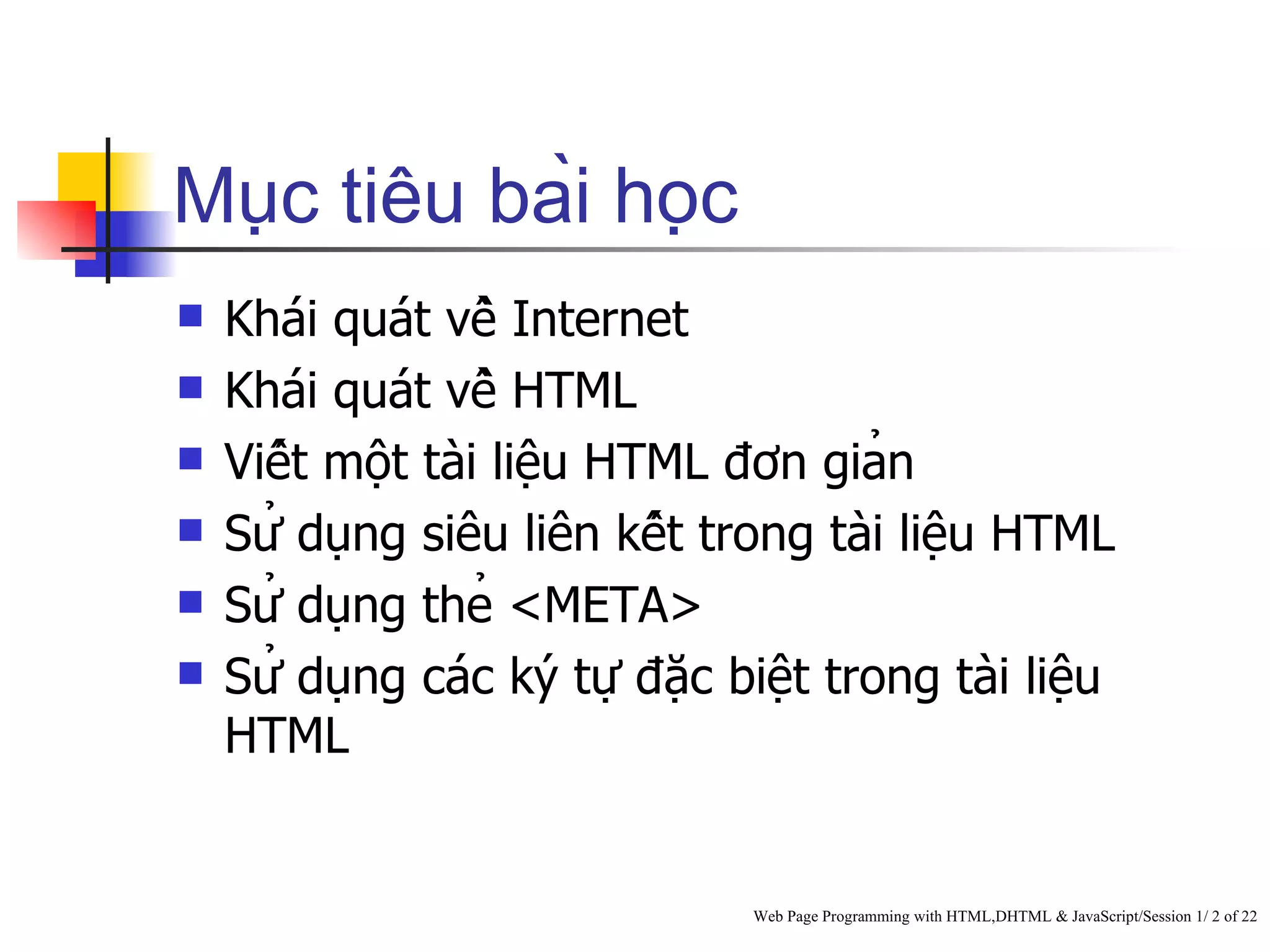 Tài liệu cung cấp cái nhìn tổng quan về Internet và HTML, hướng dẫn viết tài liệu HTML đơn giản và sử dụng siêu liên kết. Nó giải thích cấu trúc tài liệu HTML, các thẻ và cú pháp cơ bản. Ngoài ra, tài liệu còn đề cập đến cách điều hướng trang web và các ký tự đặc biệt trong HTML.