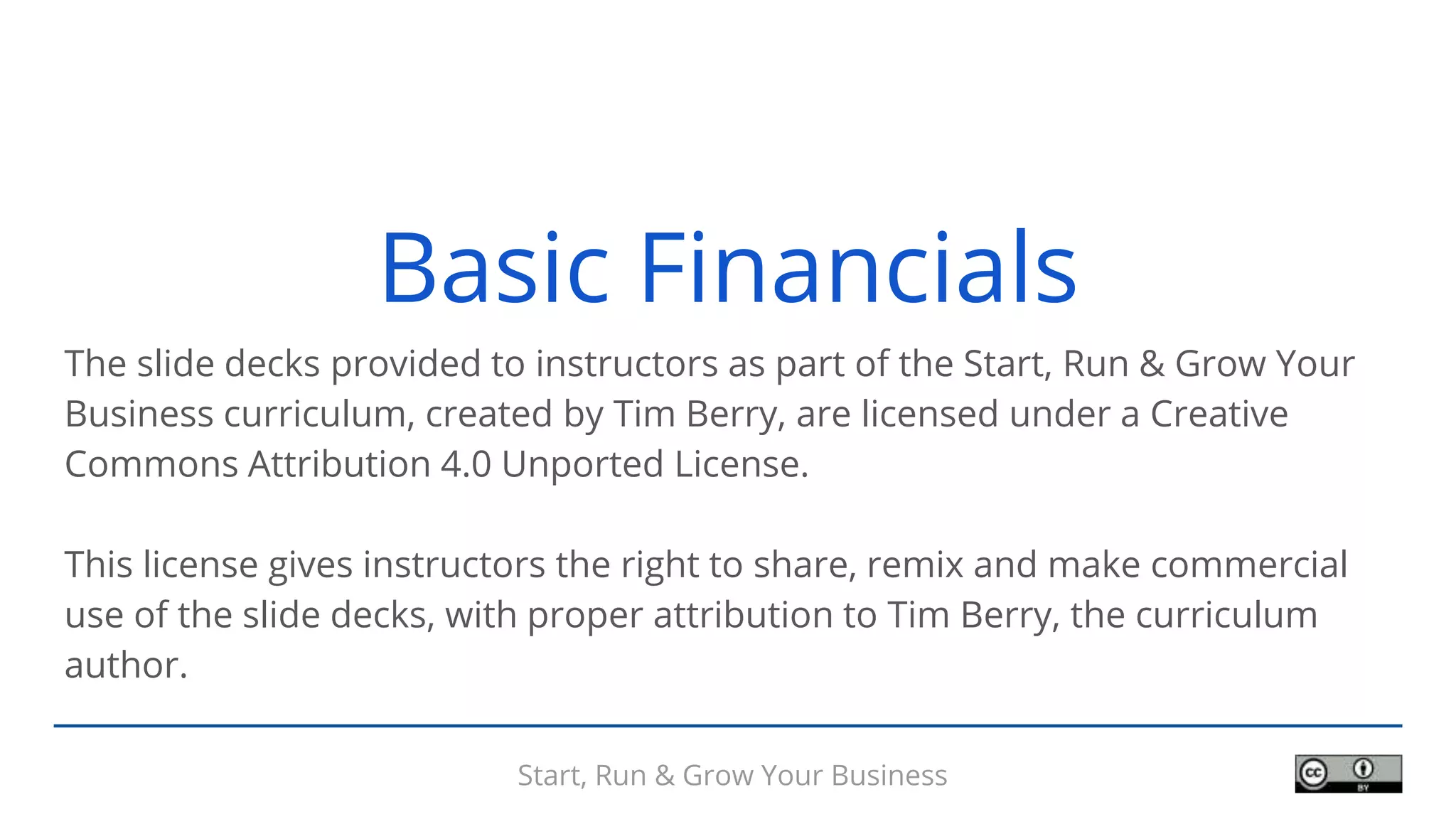 This document contains slides from a curriculum on starting, running, and growing a business. The slides cover basic accounting and financial concepts such as income statements, balance sheets, expenses, assets, costs of sales, liabilities, capital, and cash flow. They explain key terms, the differences between assets and expenses, and how accounting classifications impact taxes and business profits and cash flow. The slides are licensed under a Creative Commons license allowing for sharing and commercial use with proper attribution to the author, Tim Berry.