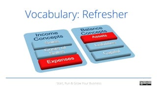 The document discusses the costs and assets required to start a business. It notes that slide decks created by Tim Berry for the Start, Run & Grow Your Business curriculum can be shared, remixed and used commercially with proper attribution. The document then lists common startup expenses like legal fees, insurance, rent, computer equipment and stationery that need funding, as well as startup assets like cash, inventory and long-term assets that are required.