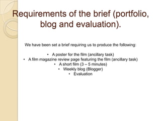 This document outlines the requirements and preliminary plans for a student film project. The brief requires a poster, film review page, 3-5 minute short film, and weekly blog. It identifies the roles of each group member as Producer, Director, Editor, and Camera/Sound. It also discusses adapting the Aesop's fable "The Boy Who Cried Wolf" as the narrative for the short film, modernizing it while keeping the original story. Plans are to develop the adapted narrative on the group's blog.