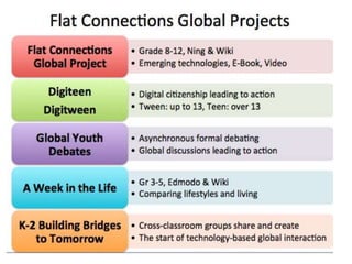 3) Examples are given of current global projects connecting classrooms in different countries through online debates and collaborative multimedia e-books involving hundreds of students across 6 countries.