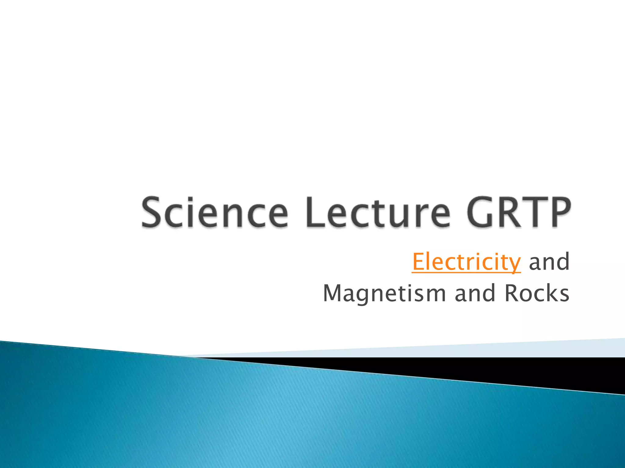 This document provides an overview of topics covered in a science lecture on electricity, magnetism, and rocks. It includes: