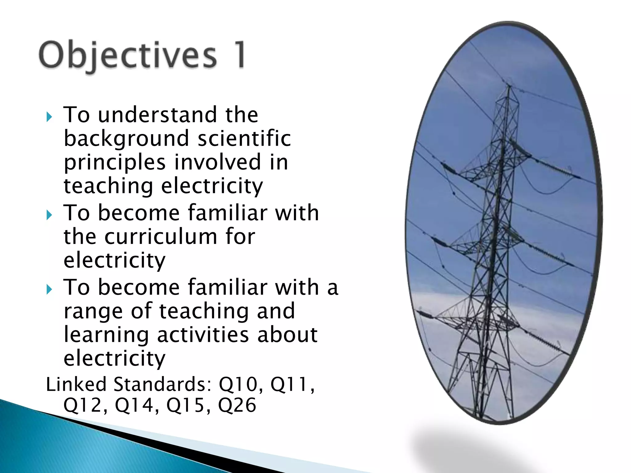 1. Objectives related to becoming familiar with teaching electricity, magnetism, and rocks as well as associated curriculum standards.