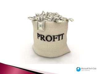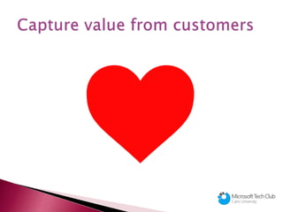 The document summarizes a presentation given by Heba T'Allah Waleed on marketing for the Microsoft Tech Club at Cairo University. It defines marketing and discusses the goals and mix of marketing, including the 4 Ps. It also outlines the marketing process, from understanding customer needs to capturing value from customers. Contact information is provided at the end for the presenter and the club's Facebook group.