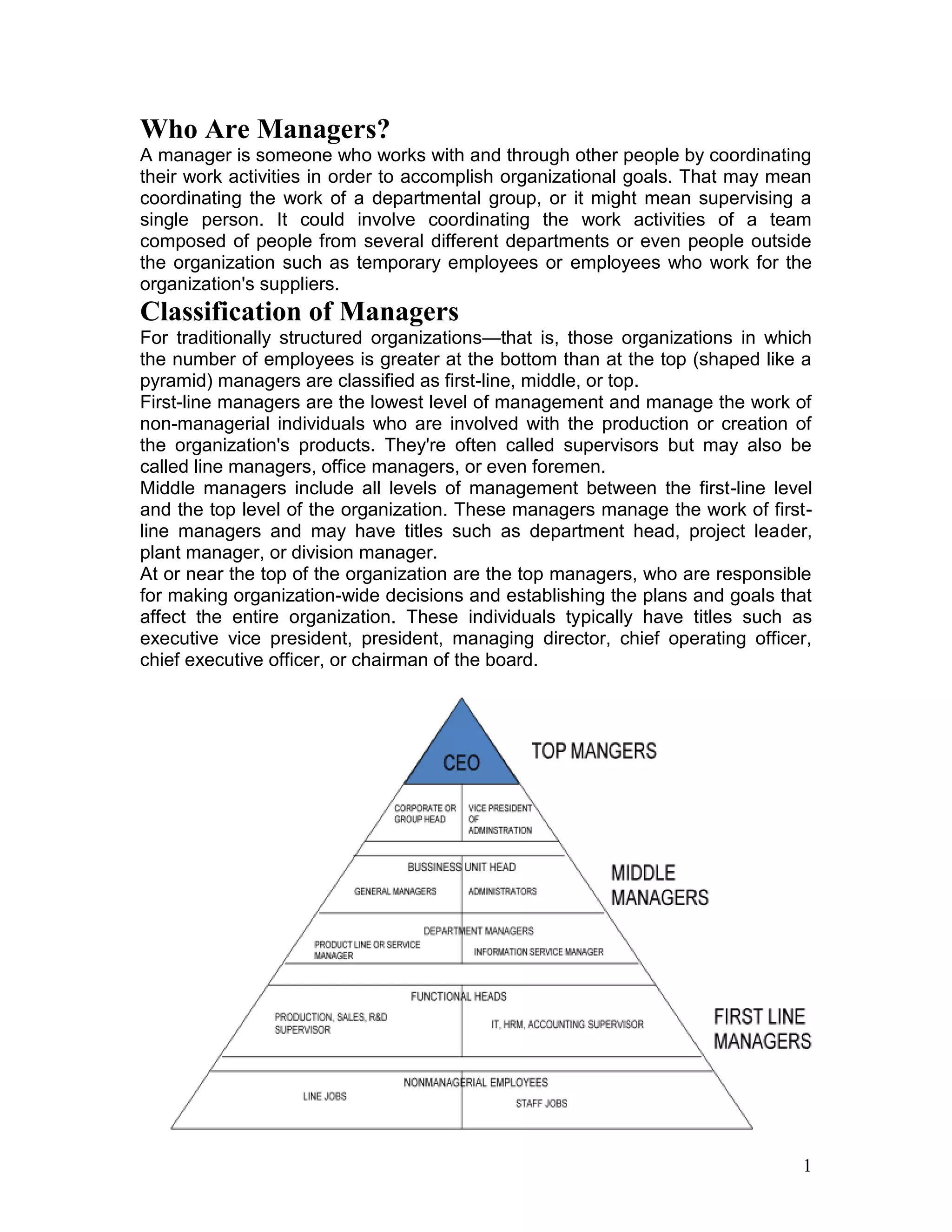 1) A manager coordinates work activities to accomplish organizational goals through and with other people. Managers are classified as first-line, middle, or top based on their level in a traditionally structured organization.