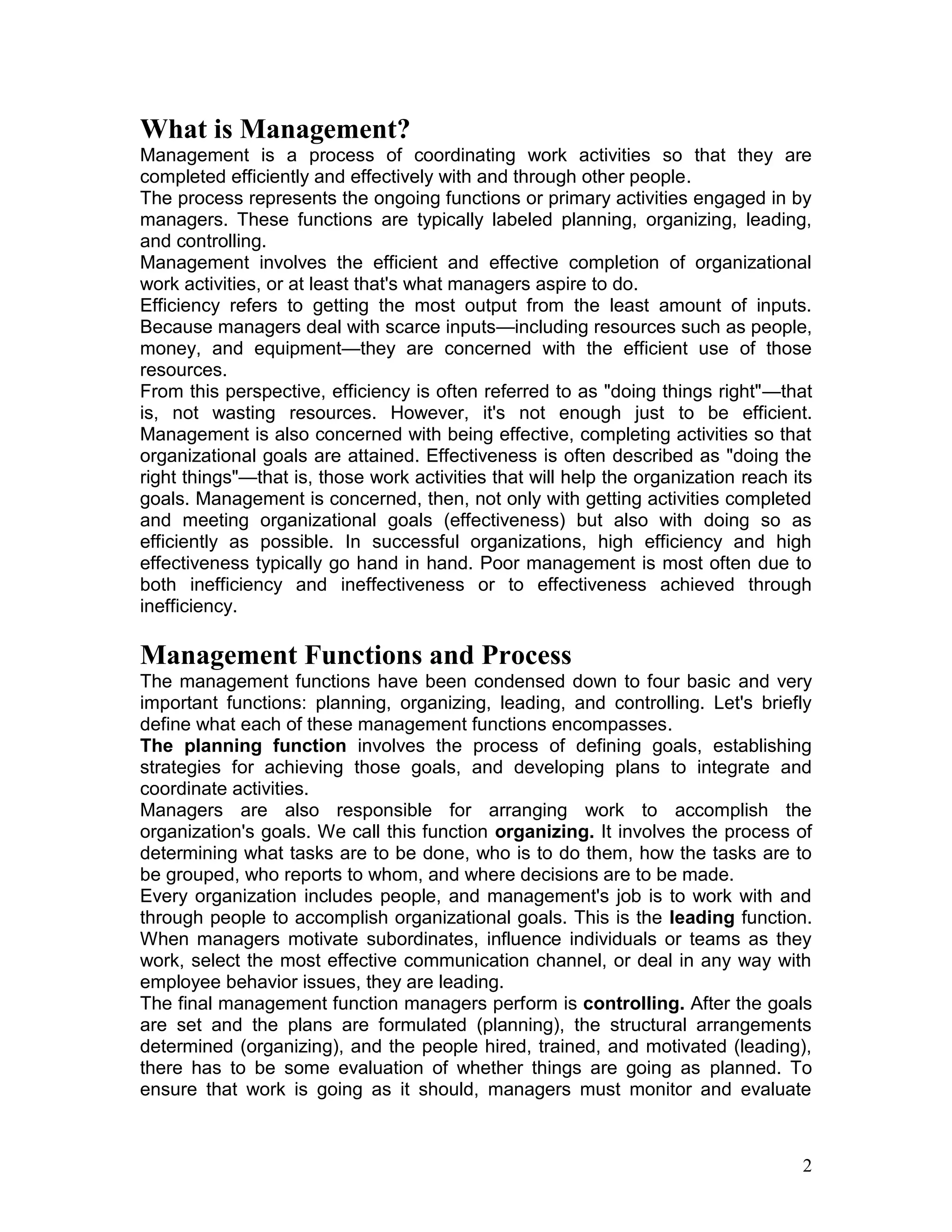 2) Management involves coordinating work through four primary functions: planning, organizing, leading, and controlling. The goal is to complete work efficiently and effectively.